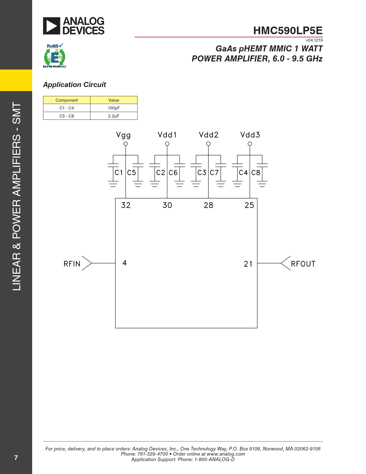 HMC590LP5E v04.1219 GaAs pHEMT MMIC 1 WATTPOWER AMPLIFIER, 6.0 - 9.5 GHzApplication Circuit T Component Value M C1 - C4 100pF C5 - C8 2.2µF S - S R IE LIF P M R A E W O R & P A E LIN For price, delivery, and to place orders: Analog Devices, Inc., One Technology Way, P.O. Box 9106, Norwood, MA 02062-9106 Phone: 781-329-4700 • Order online at www.analog.com 7 Application Support: Phone: 1-800-ANALOG-D Document Outline Typical Applications Features Functional Diagram General Description Electrical Specifications Performance Characteristics Broadband Gain & Return Loss Gain vs. Temperature Input Return Loss vs. Temperature Output Return Loss vs. Temperature P1dB vs. Temperature Psat vs. Temperature P1dB vs. Current Psat vs. Current Output IP3 vs. Temperature 7V @ 520 mA, Pin/Tone = -15 dBm Power Compression @ 8 GHz, 7V @ 820 mA Output IM3, 7V @ 820 mA Gain & Power vs. Supply Current @ 8 GHz Gain & Power vs. Supply Voltage @ 8 GHz Reverse Isolation vs. Temperature, 7V @ 820 mA Power Dissipation Absolute Maximum Ratings Typical Supply Current vs. Vdd Outline Drawing Package Information Pin Descriptions Application Circuit Evaluation PCB List of Materials for Evaluation PCB 115927