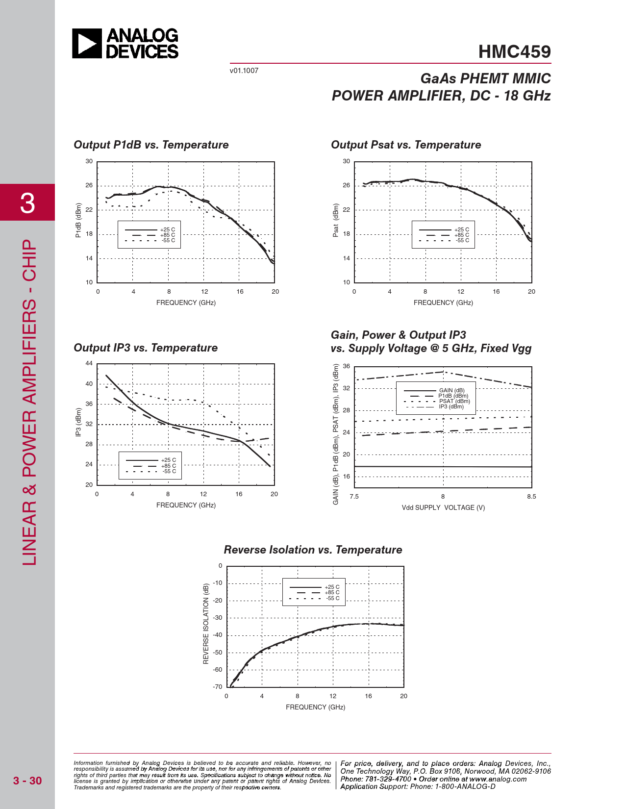 HMC459 v01.1007 GaAs PHEMT MMICPOWER AMPLIFIER, DC - 18 GHzOutput P1dB vs. TemperatureOutput Psat vs. Temperature 30 30 26 26 3 22 22 +25 C +25 C 18 P1dB (dBm) +85 C Psat (dBm) 18 +85 C -55 C -55 C IP H 14 14 10 10 0 4 8 12 16 20 0 4 8 12 16 20 S - C FREQUENCY (GHz) FREQUENCY (GHz) R IE Gain, Power & Output IP3 IF Output IP3 vs. Temperaturevs. Supply Voltage @ 5 GHz, Fixed Vgg L 44 P 36 M 40 32 GAIN (dB) P1dB (dBm) 36 PSAT (dBm) IP3 (dBm) R A 28 E 32 IP3 (dBm) PSAT (dBm), IP3 (dBm) 24 W 28 O 20 +25 C 24 +85 C -55 C 16 20 0 4 8 12 16 20 7.5 8 8.5 R & P FREQUENCY (GHz) GAIN (dB), P1dB (dBm), Vdd SUPPLY VOLTAGE (V) A E IN Reverse Isolation vs. Temperature L 0 -10 +25 C +85 C -20 -55 C -30 -40 -50 REVERSE ISOLATION (dB) -60 -70 0 4 8 12 16 20 FREQUENCY (GHz) Information furnish F ed obr pri y Anal ce, de og Device li s vie s r beyli, a eve nd to pla d to be accura ce o te and rder reliabl s e , pl . Ho ease co wever, no For price, delivery, and to place orders: Analog Devices, Inc., responsibility is assumed by Analog Devices for its use, nor for any infringements of patents or other ntact Hittite Microwave Corporation: One Technology Way, P.O. Box 9106, Norwood, MA 02062-9106 rights of third parties that may result from its use. Specifications subject to change without notice. No 3 - 30 20 Alpha Road, Chelmsford, MA 01824 Phone: 978 Phon - e 25 : 7 0 81--3 32 3 9 4 - 3 F 70 ax 0 • O : 978 rder on -li25 n 0 e a - t 33 ww 73 license is granted by implication or otherwise under any patent or patent rights of Analog Devices. w.analog.com Order On Trademarks and registered trademarks are the property of their respective owners. -line at www.h A it p tpite.co licatio m n Support: Phone: 1-800-ANALOG-D