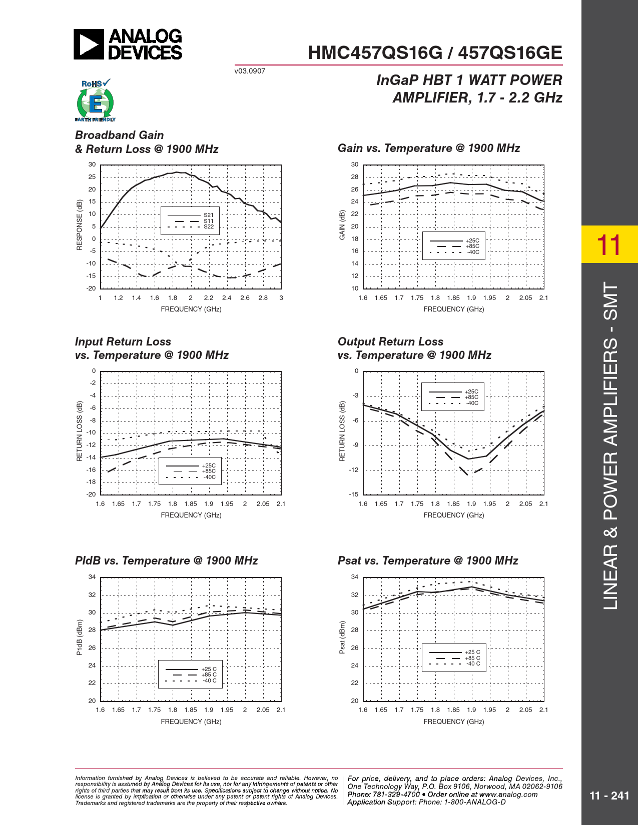 HMC457QS16G / 457QS16GE v03.0907 InGaP HBT 1 WATT POWERAMPLIFIER, 1.7 - 2.2 GHzBroadband Gain & Return Loss @ 1900 MHzGain vs. Temperature @ 1900 MHz 30 30 25 28 20 26 15 24 10 S21 22 S11 (dB) 5 S22 20 0 GAIN 18 +25C RESPONSE (dB) +85C -5 16 -40C 11 -10 14 -15 12 -20 10 T 1 1.2 1.4 1.6 1.8 2 2.2 2.4 2.6 2.8 3 1.6 1.65 1.7 1.75 1.8 1.85 1.9 1.95 2 2.05 2.1 FREQUENCY (GHz) FREQUENCY (GHz) - SM Input Return LossOutput Return Loss S vs. Temperature @ 1900 MHzvs. Temperature @ 1900 MHz R 0 0 IE -2 +25C -4 -3 +85C IF -40C L -6 P -8 -6 -10 M -12 -9 -14 RETURN LOSS (dB) RETURN LOSS (dB) +25C R A -16 +85C -12 -40C E -18 -20 -15 W 1.6 1.65 1.7 1.75 1.8 1.85 1.9 1.95 2 2.05 2.1 1.6 1.65 1.7 1.75 1.8 1.85 1.9 1.95 2 2.05 2.1 O FREQUENCY (GHz) FREQUENCY (GHz) & P R PldB vs. Temperature @ 1900 MHzPsat vs. Temperature @ 1900 MHz A 34 34 E 32 32 IN L 30 30 28 28 26 26 P1dB (dBm) Psat (dBm) +25 C +85 C 24 24 -40 C +25 C +85 C 22 -40 C 22 20 20 1.6 1.65 1.7 1.75 1.8 1.85 1.9 1.95 2 2.05 2.1 1.6 1.65 1.7 1.75 1.8 1.85 1.9 1.95 2 2.05 2.1 FREQUENCY (GHz) FREQUENCY (GHz) Information furnish F e o d r pri by An ce, de alog Devic leis vie s rby eli, a eve nd to pla d to be accur ce o ate an r d der relia s ble , pl . Ho ease co wever, no For price, delivery, and to place orders: Analog Devices, Inc., responsibility is assumed by Analog Devices for its use, nor for any infringements of patents or other ntact Hittite Microwave Corporation: One Technology Way, P.O. Box 9106, Norwood, MA 02062-9106 20 Alpha Road, Chelmsford, MA 01824 Phone rights of third parties that may result from its use. Specifications subject to change without notice. No : 978 Pho - n 25 e: 7 0- 81 3 3 3 2 4 9- 3 F 470 ax: 978 0 • Order o - n 25 lin 0 e a-t 3373 license is granted by implication or otherwise under any patent or patent rights of Analog Devices. www.analog.com 11 - 241 Order On- Trademarks and registered trademarks are the property of their respective owners. line at www.hi A tptipte.co licatio m n Support: Phone: 1-800-ANALOG-D