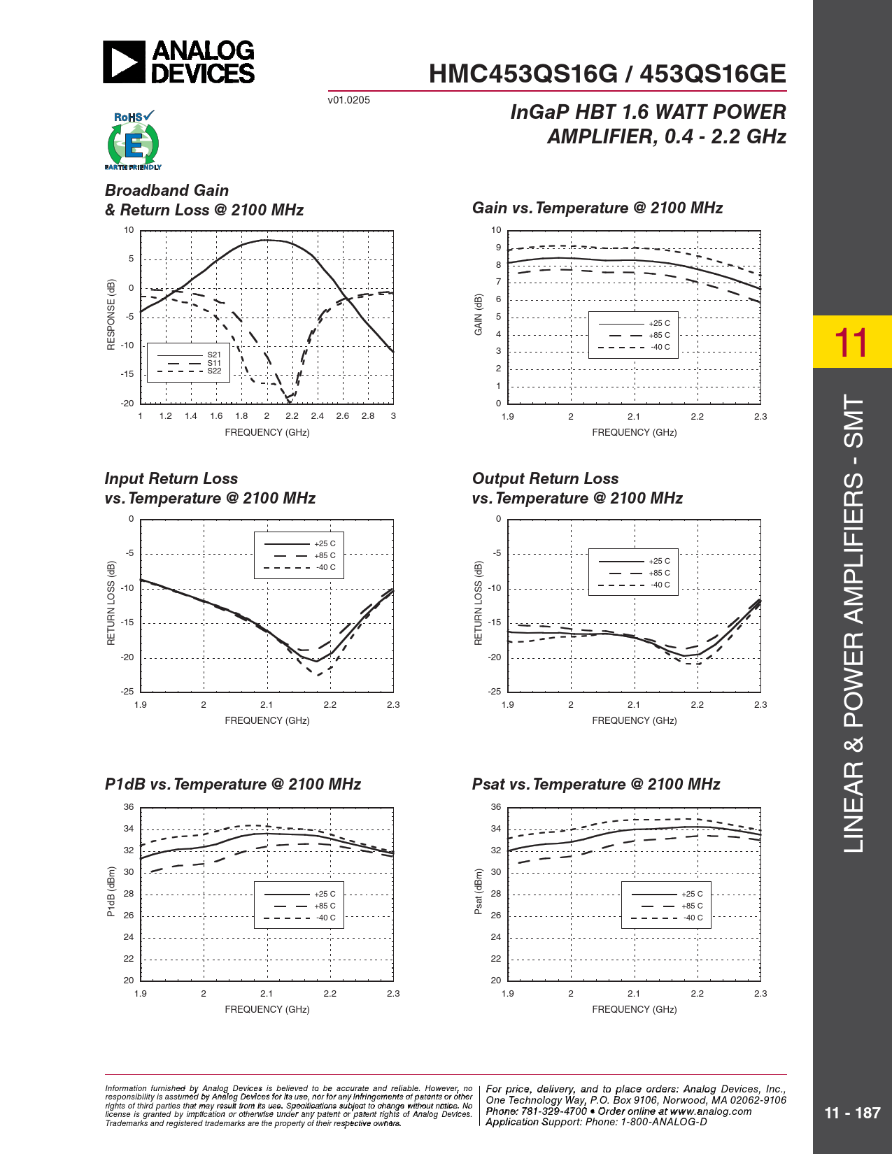 0 0 +25 C -5 -5 +85 C +25 C -40 C +85 C -10 -10 -40 C PLIFIER M -15 -15 RETURN LOSS (dB) RETURN LOSS (dB) -20 -20 ER A -25 -25 W 1.9 2 2.1 2.2 2.3 1.9 2 2.1 2.2 2.3 O FREQUENCY (GHz) FREQUENCY (GHz) & P R