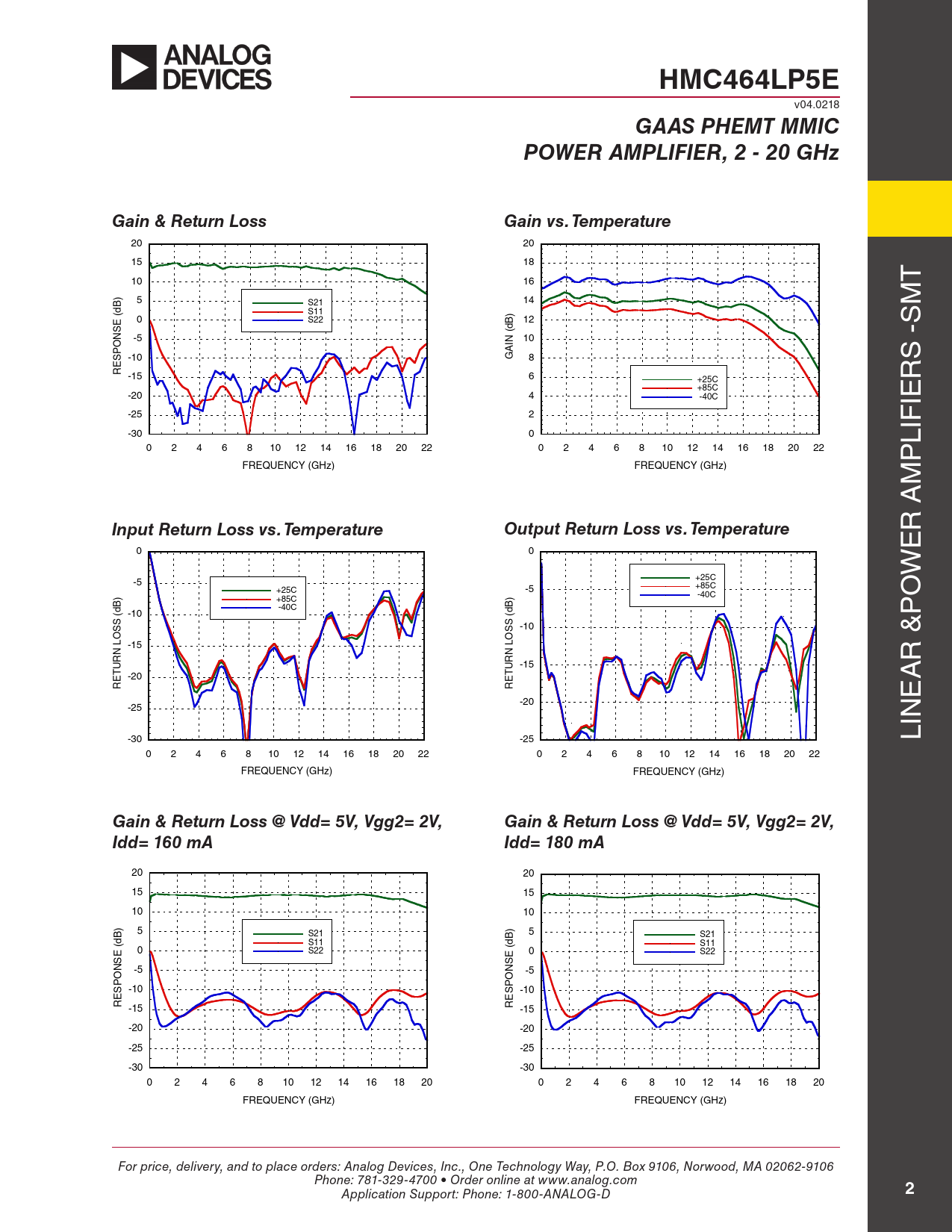HMC464LP5E v04.0218 GAAS PHEMT MMICPOWER AMPLIFIER, 2 - 20 GHzGain & Return LossGain vs. Temperature 20 20 15 18 10 16 T 5 S21 B) 14 M S11 (d ) 0 S22 B 12 d S SE ( N -5 10 IN A -10 G 8 S - ESPO R -15 6 +25C R +85C -20 4 -40C IE -25 2 -30 0 LIF 0 2 4 6 8 10 12 14 16 18 20 22 0 2 4 6 8 10 12 14 16 18 20 22 P FREQUENCY (GHz) FREQUENCY (GHz) M Input Return Loss vs. TemperatureOutput Return Loss vs. Temperature R A 0 0 E +25C W -5 +85C +25C -5 ) -40C +85C ) O B -40C B (d -10 (d P S S S -10 S O O L -15 L N N R & UR -15 UR T -20 T A RE RE E -20 -25 -30 -25 LIN 0 2 4 6 8 10 12 14 16 18 20 22 0 2 4 6 8 10 12 14 16 18 20 22 FREQUENCY (GHz) FREQUENCY (GHz) Gain & Return Loss @ Vdd= 5V, Vgg2= 2V,Gain & Return Loss @ Vdd= 5V, Vgg2= 2V,Idd= 160 mAIdd= 180 mA 20 20 15 15 10 10 5 S21 B) 5 S21 B) S11 (d S11 (d 0 S22 0 S22 SE SE N -5 N -5 -10 -10 ESPO ESPO R -15 R -15 -20 -20 -25 -25 -30 -30 0 2 4 6 8 10 12 14 16 18 20 0 2 4 6 8 10 12 14 16 18 20 FREQUENCY (GHz) FREQUENCY (GHz) For price, delivery, and to place orders: Analog Devices, Inc., One Technology Way, P.O. Box 9106, Norwood, MA 02062-9106 Phone: 781-329-4700 • Order online at www.analog.com Application Support: Phone: 1-800-ANALOG-D 2