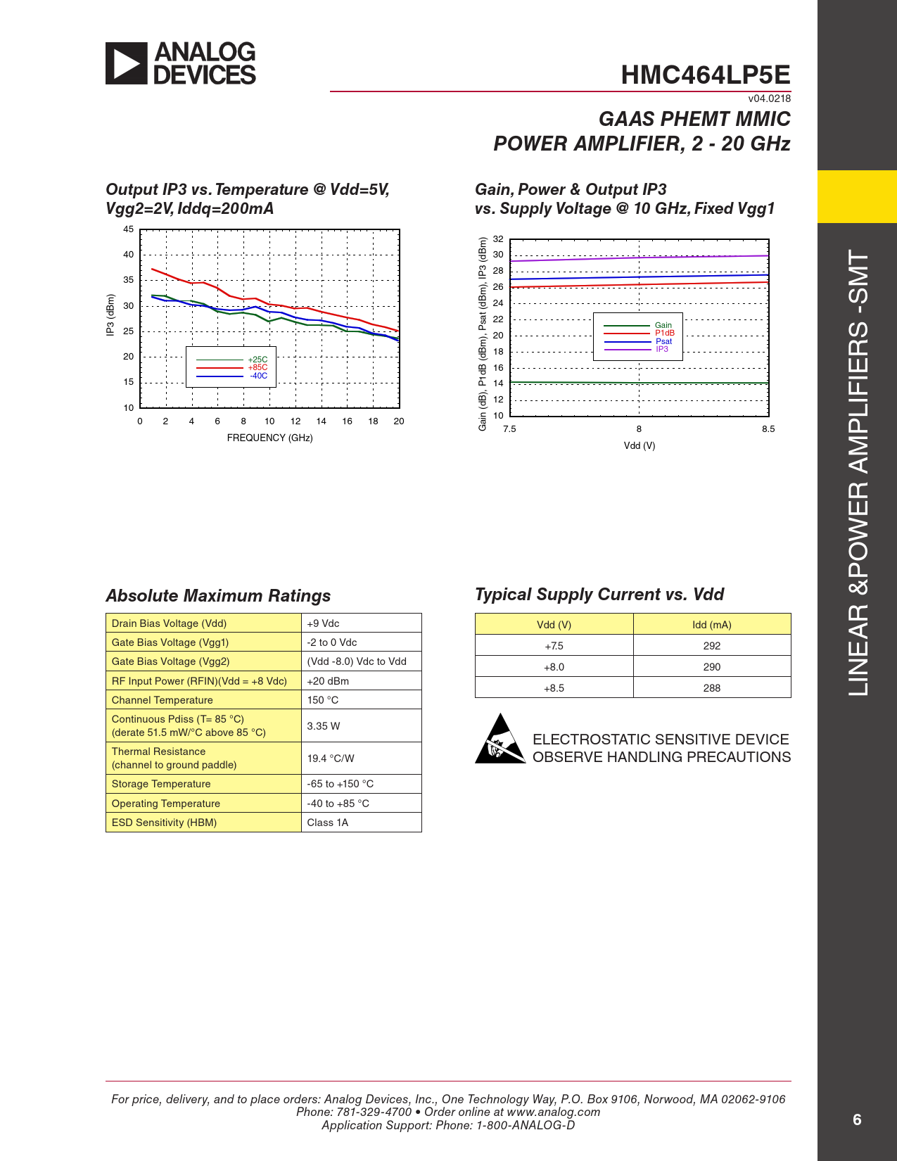 Drain Bias Voltage (Vdd) +9 Vdc Vdd (V) Idd (mA) R & Gate Bias Voltage (Vgg1) -2 to 0 Vdc A +7.5 292 E Gate Bias Voltage (Vgg2) (Vdd -8.0) Vdc to Vdd +8.0 290 RF Input Power (RFIN)(Vdd = +8 Vdc) +20 dBm +8.5 288 Channel Temperature 150 °C LIN Continuous Pdiss (T= 85 °C) 3.35 W (derate 51.5 mW/°C above 85 °C) ELECTROSTATIC SENSITIVE DEVICE Thermal Resistance 19.4 °C/W OBSERVE HANDLING PRECAUTIONS (channel to ground paddle) Storage Temperature -65 to +150 °C Operating Temperature -40 to +85 °C ESD Sensitivity (HBM) Class 1A For price, delivery, and to place orders: Analog Devices, Inc., One Technology Way, P.O. Box 9106, Norwood, MA 02062-9106 Phone: 781-329-4700 • Order online at www.analog.com Application Support: Phone: 1-800-ANALOG-D