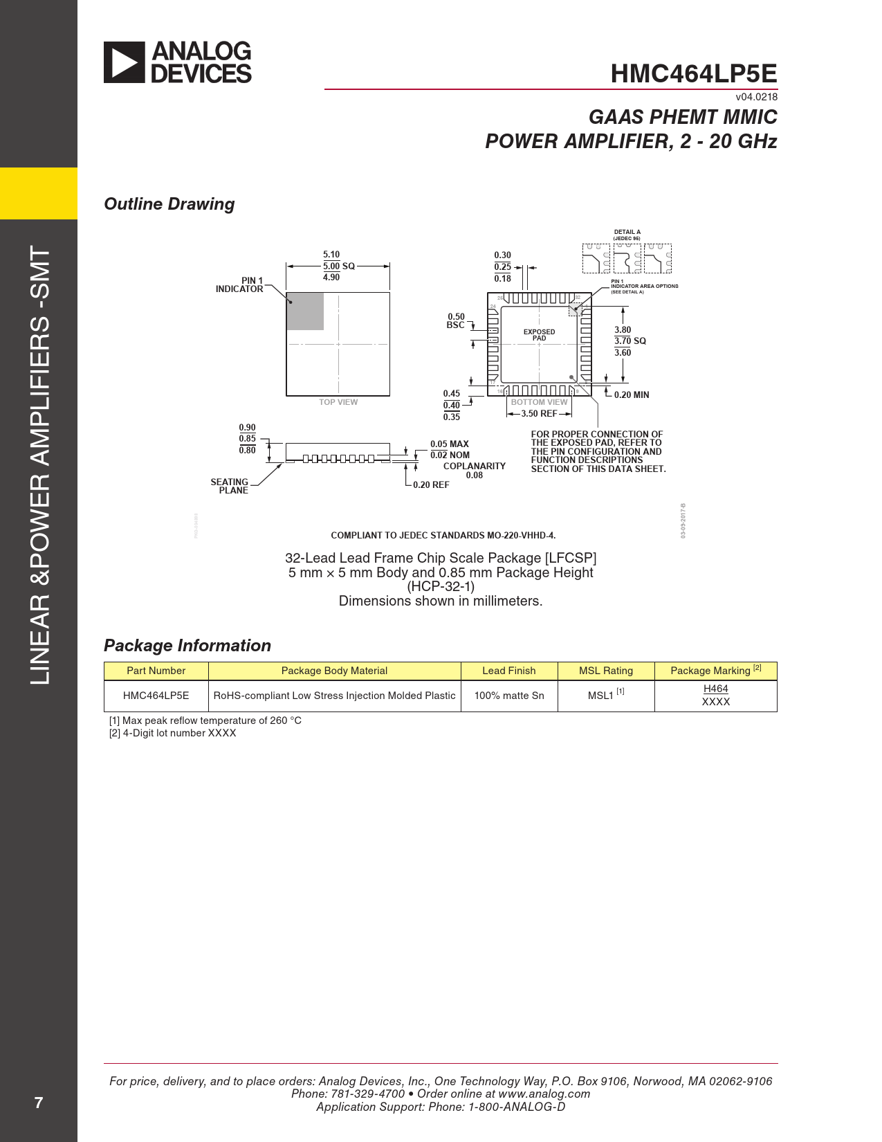 HMC464LP5E v04.0218 GAAS PHEMT MMICPOWER AMPLIFIER, 2 - 20 GHz32-Lead Lead Frame Chip Scale Package [LFCSP]5 x 5 mm Body and 0.85 mm Package HeightOutline Drawing(HCP-32-1)Dimensions shown in millimetersDETAIL A T (JEDEC 95)5.100.30 M 5.00 SQ0.25 S PIN 14.900.18PIN 1INDICATORINDICATOR AREA OPTIONS(SEE DETAIL A)2532241 S - 0.50BSC R EXPOSED3.80PAD3.70 SQ IE 3.60178 LIF 1690.450.20 MINTOP VIEWBOTTOM VIEW P 0.400.353.50 REF M 0.900.85FOR PROPER CONNECTION OF0.05 MAXTHE EXPOSED PAD, REFER TO0.800.02 NOMTHE PIN CONFIGURATION ANDFUNCTION DESCRIPTIONSCOPLANARITY R A SECTION OF THIS DATA SHEET.0.08SEATING E PLANE0.20 REF W O PKG-004898COMPLIANT TO JEDEC STANDARDS MO-220-VHHD-4.03-09-2017-B P 32-Lead Lead Frame Chip Scale Package [LFCSP] 5 mm × 5 mm Body and 0.85 mm Package Height (HCP-32-1) R & Dimensions shown in mil imeters. A E Package Information LIN Part Number Package Body Material Lead Finish MSL Rating Package Marking [2] HMC464LP5E RoHS-compliant Low Stress Injection Molded Plastic 100% matte Sn MSL1 [1] H464 XXXX [1] Max peak reflow temperature of 260 °C [2] 4-Digit lot number XXXX For price, delivery, and to place orders: Analog Devices, Inc., One Technology Way, P.O. Box 9106, Norwood, MA 02062-9106 Phone: 781-329-4700 • Order online at www.analog.com 7 Application Support: Phone: 1-800-ANALOG-D
