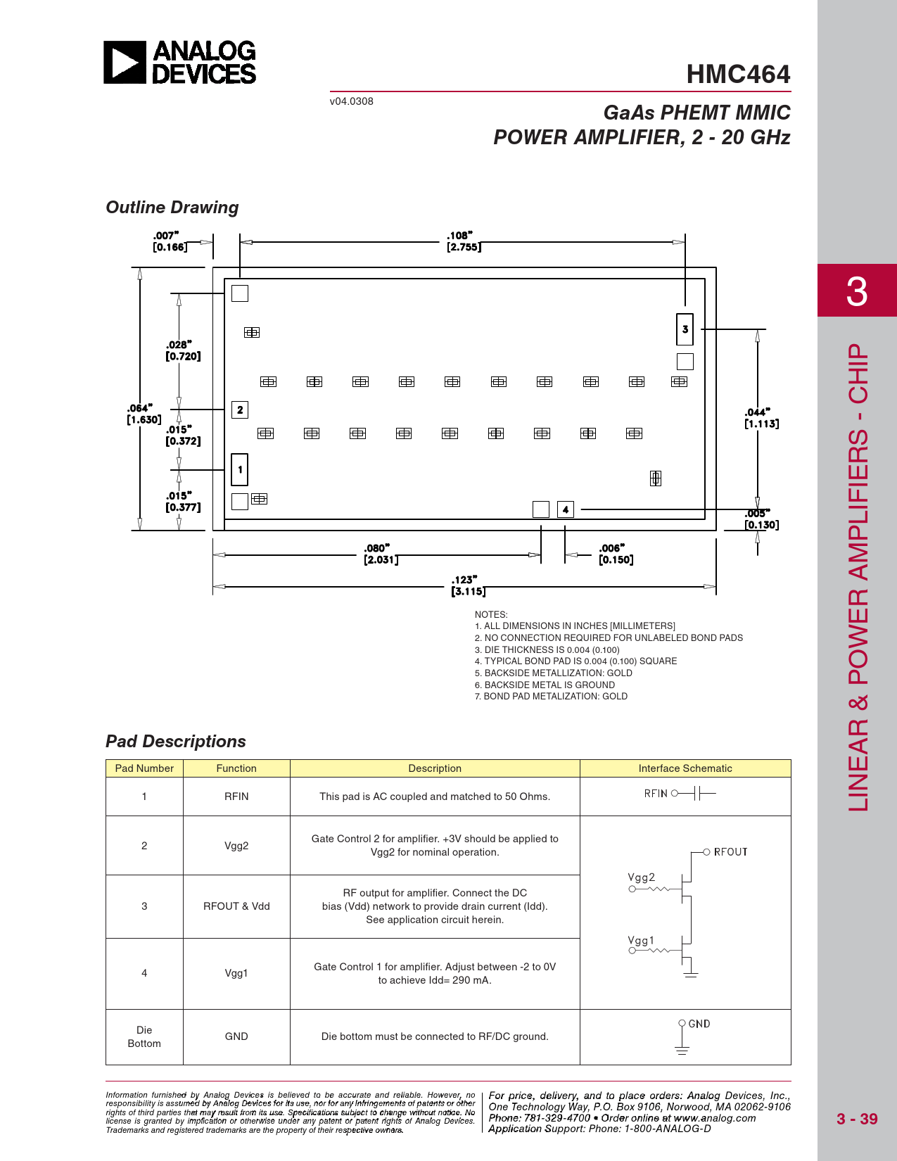 HMC464. GaAs PHEMT MMIC. POWER AMPLIFIER, 2 - 20 GHz. Outline Drawing. Pad Descriptions. 3 - 39