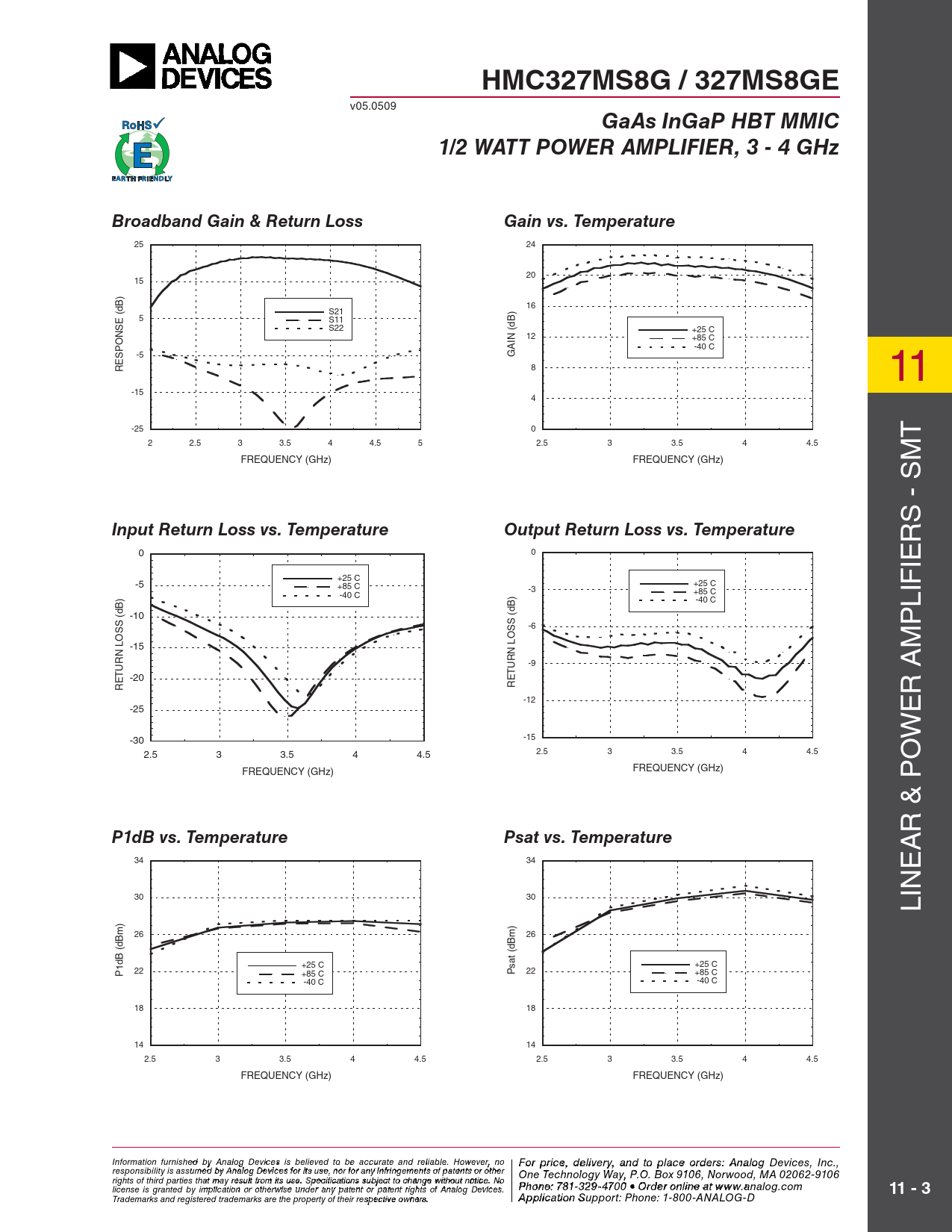 25 24 20 15 16 S21 5 S11 S22 (dB) +25 C 12 +85 C -40 C -5 GAIN RESPONSE (dB) 8 11 -15 4 -25 0 T 2 2.5 3 3.5 4 4.5 5 2.5 3 3.5 4 4.5 FREQUENCY (GHz) FREQUENCY (GHz) - SM S