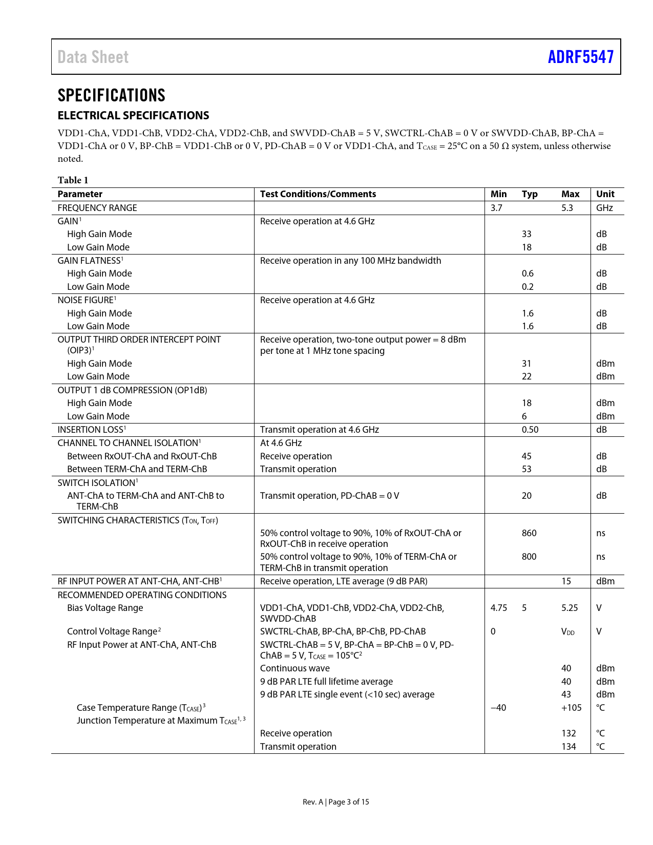 link to page 4 link to page 4 link to page 4 link to page 4 link to page 4 link to page 4 link to page 4 link to page 4 link to page 4 link to page 4 link to page 4 link to page 4 Data SheetADRF5547SPECIFICATIONS ELECTRICAL SPECIFICATIONS VDD1-ChA, VDD1-ChB, VDD2-ChA, VDD2-ChB, and SWVDD-ChAB = 5 V, SWCTRL-ChAB = 0 V or SWVDD-ChAB, BP-ChA = VDD1-ChA or 0 V, BP-ChB = VDD1-ChB or 0 V, PD-ChAB = 0 V or VDD1-ChA, and TCASE = 25°C on a 50 Ω system, unless otherwise noted. Table 1 ParameterTest Conditions/CommentsMinTypMaxUnit FREQUENCY RANGE 3.7 5.3 GHz GAIN1 Receive operation at 4.6 GHz High Gain Mode 33 dB Low Gain Mode 18 dB GAIN FLATNESS1 Receive operation in any 100 MHz bandwidth High Gain Mode 0.6 dB Low Gain Mode 0.2 dB NOISE FIGURE1 Receive operation at 4.6 GHz High Gain Mode 1.6 dB Low Gain Mode 1.6 dB OUTPUT THIRD ORDER INTERCEPT POINT Receive operation, two-tone output power = 8 dBm (OIP3)1 per tone at 1 MHz tone spacing High Gain Mode 31 dBm Low Gain Mode 22 dBm OUTPUT 1 dB COMPRESSION (OP1dB) High Gain Mode 18 dBm Low Gain Mode 6 dBm INSERTION LOSS1 Transmit operation at 4.6 GHz 0.50 dB CHANNEL TO CHANNEL ISOLATION1 At 4.6 GHz Between RxOUT-ChA and RxOUT-ChB Receive operation 45 dB Between TERM-ChA and TERM-ChB Transmit operation 53 dB SWITCH ISOLATION1 ANT-ChA to TERM-ChA and ANT-ChB to Transmit operation, PD-ChAB = 0 V 20 dB TERM-ChB SWITCHING CHARACTERISTICS (TON, TOFF) 50% control voltage to 90%, 10% of RxOUT-ChA or 860 ns RxOUT-ChB in receive operation 50% control voltage to 90%, 10% of TERM-ChA or 800 ns TERM-ChB in transmit operation RF INPUT POWER AT ANT-CHA, ANT-CHB1 Receive operation, LTE average (9 dB PAR) 15 dBm RECOMMENDED OPERATING CONDITIONS Bias Voltage Range VDD1-ChA, VDD1-ChB, VDD2-ChA, VDD2-ChB, 4.75 5 5.25 V SWVDD-ChAB Control Voltage Range2 SWCTRL-ChAB, BP-ChA, BP-ChB, PD-ChAB 0 VDD V RF Input Power at ANT-ChA, ANT-ChB SWCTRL-ChAB = 5 V, BP-ChA = BP-ChB = 0 V, PD- ChAB = 5 V, TCASE = 105°C2 Continuous wave 40 dBm 9 dB PAR LTE full lifetime average 40 dBm 9 dB PAR LTE single event (<10 sec) average 43 dBm Case Temperature Range (TCASE)3 −40 +105 °C Junction Temperature at Maximum T 1, 3 CASE Receive operation 132 °C Transmit operation 134 °C Rev. A | Page 3 of 15 Document Outline FEATURES APPLICATIONS GENERAL DESCRIPTION FUNCTIONAL BLOCK DIAGRAM TABLE OF CONTENTS REVISION HISTORY SPECIFICATIONS ELECTRICAL SPECIFICATIONS ABSOLUTE MAXIMUM RATINGS THERMAL RESISTANCE ESD CAUTION PIN CONFIGURATION AND FUNCTION DESCRIPTIONS INTERFACE SCHEMATICS TYPICAL PERFORMANCE CHARACTERISTICS RECEIVE OPERATION, HIGH GAIN MODE RECEIVE OPERATION, LOW GAIN MODE TRANSMIT OPERATION THEORY OF OPERATION SIGNAL PATH SELECT Receive Operation BIASING SEQUENCE APPLICATIONS INFORMATION OUTLINE DIMENSIONS ORDERING GUIDE