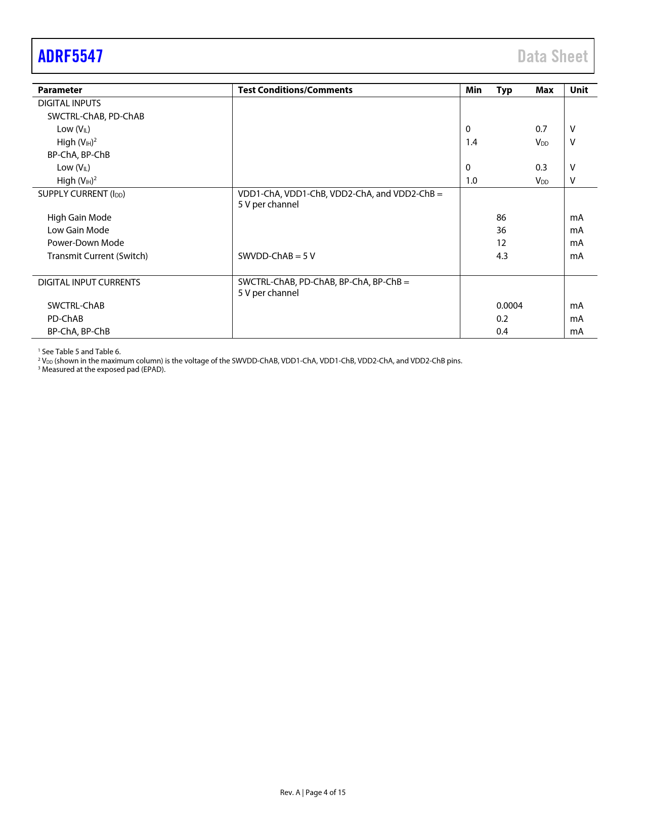 Páginas / Página15 / 4 — ADRF5547. Data Sheet. Parameter. Test Conditions/Comments. Min. Typ. Max. …