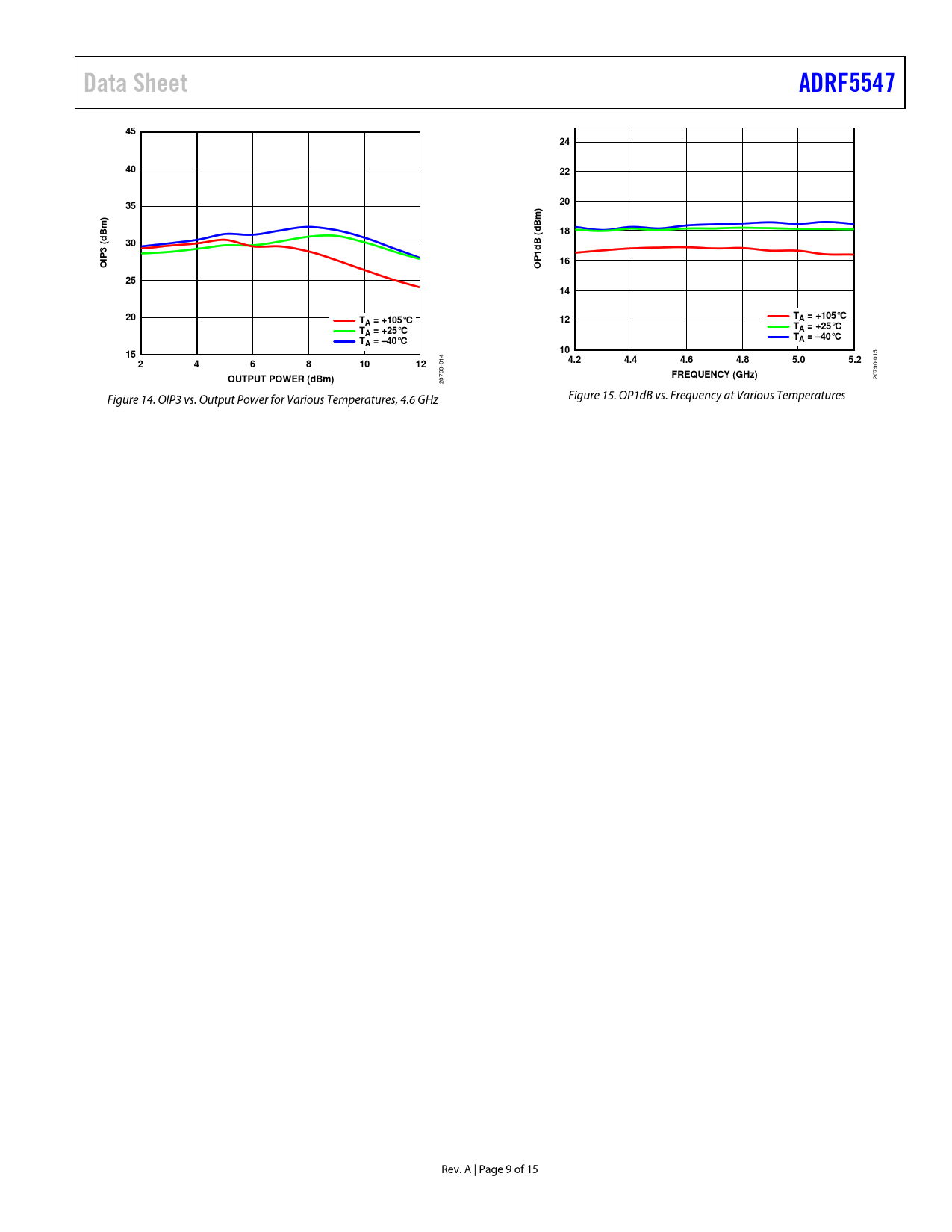 Data SheetADRF5547452440222035Bm)Bm)d18d30B (3 (1dIPPO16O251420TTA = +105°CA = +105°C12TTA = +25°CA = +25°CTTA = –40°CA = –40°C10154.24.44.64.85.05.2 015 24681012 014 FREQUENCY (GHz)OUTPUT POWER (dBm) 20790- 20790- Figure 14. OIP3 vs. Output Power for Various Temperatures, 4.6 GHz Figure 15. OP1dB vs. Frequency at Various Temperatures Rev. A | Page 9 of 15 Document Outline FEATURES APPLICATIONS GENERAL DESCRIPTION FUNCTIONAL BLOCK DIAGRAM TABLE OF CONTENTS REVISION HISTORY SPECIFICATIONS ELECTRICAL SPECIFICATIONS ABSOLUTE MAXIMUM RATINGS THERMAL RESISTANCE ESD CAUTION PIN CONFIGURATION AND FUNCTION DESCRIPTIONS INTERFACE SCHEMATICS TYPICAL PERFORMANCE CHARACTERISTICS RECEIVE OPERATION, HIGH GAIN MODE RECEIVE OPERATION, LOW GAIN MODE TRANSMIT OPERATION THEORY OF OPERATION SIGNAL PATH SELECT Receive Operation BIASING SEQUENCE APPLICATIONS INFORMATION OUTLINE DIMENSIONS ORDERING GUIDE