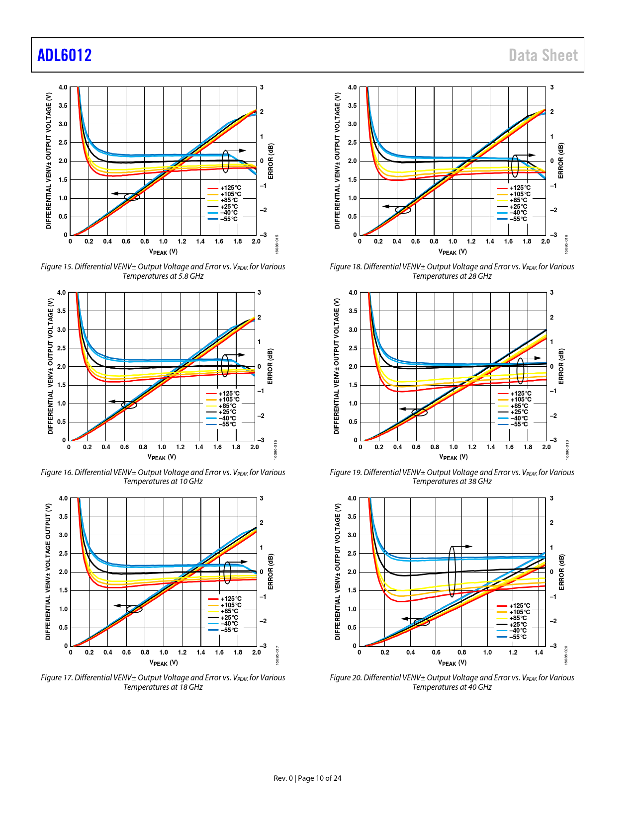 16086- Figure 16. Differential VENV± Output Voltage and Error vs. VPEAK for Various Figure 19. Differential VENV± Output Voltage and Error vs. VPEAK for Various Temperatures at 10 GHz Temperatures at 38 GHz