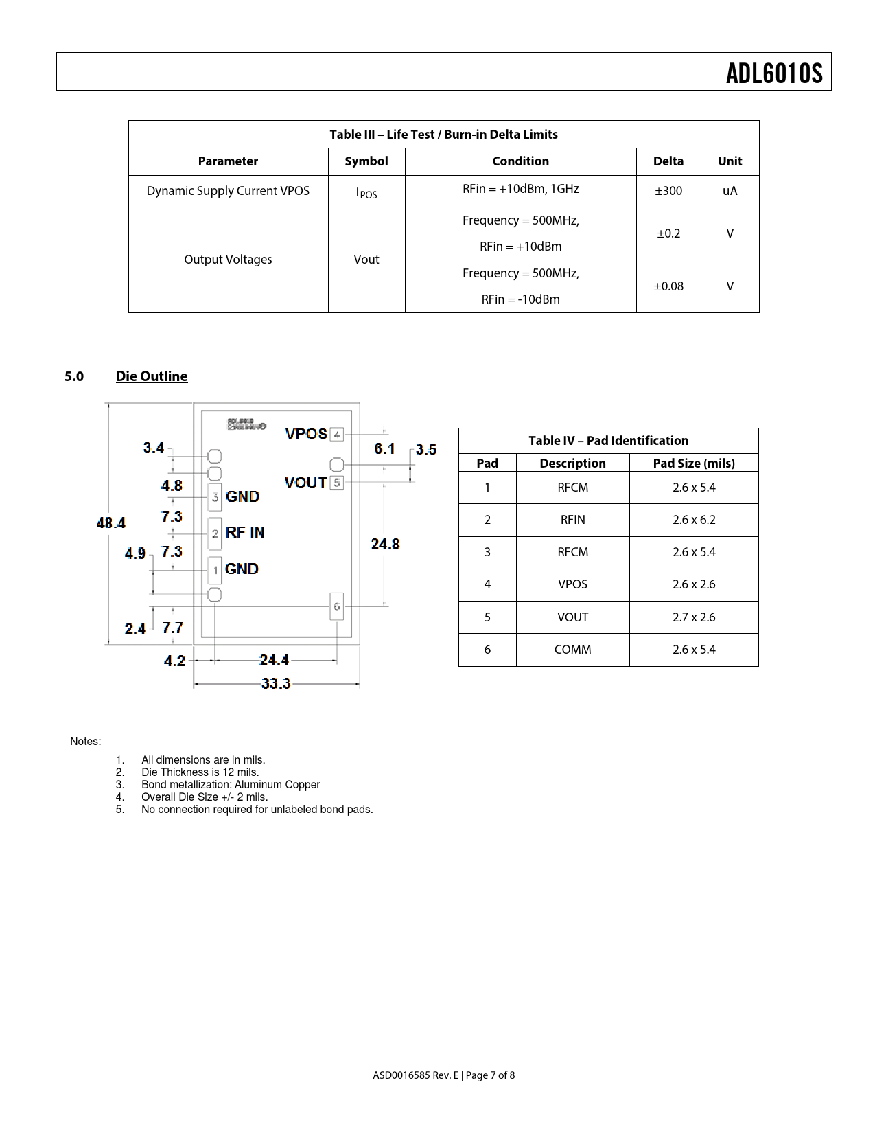 ADL6010STable III – Life Test / Burn-in Delta LimitsParameterSymbolConditionDeltaUnit Dynamic Supply Current VPOS I RFin = +10dBm, 1GHz POS ±300 uA Frequency = 500MHz, ±0.2 V RFin = +10dBm Output Voltages Vout Frequency = 500MHz, ±0.08 V RFin = -10dBm 5.0Die OutlineTable IV – Pad IdentificationPadDescriptionPad Size (mils) 1 RFCM 2.6 x 5.4 2 RFIN 2.6 x 6.2 3 RFCM 2.6 x 5.4 4 VPOS 2.6 x 2.6 5 VOUT 2.7 x 2.6 6 COMM 2.6 x 5.4 Notes: 1. All dimensions are in mils. 2. Die Thickness is 12 mils. 3. Bond metallization: Aluminum Copper 4. Overall Die Size +/- 2 mils. 5. No connection required for unlabeled bond pads. ASD0016585 Rev. E | Page 7 of 8 Document Outline AlCu (a) Qual Sample Size and Qual Acceptance Criteria – 10/0