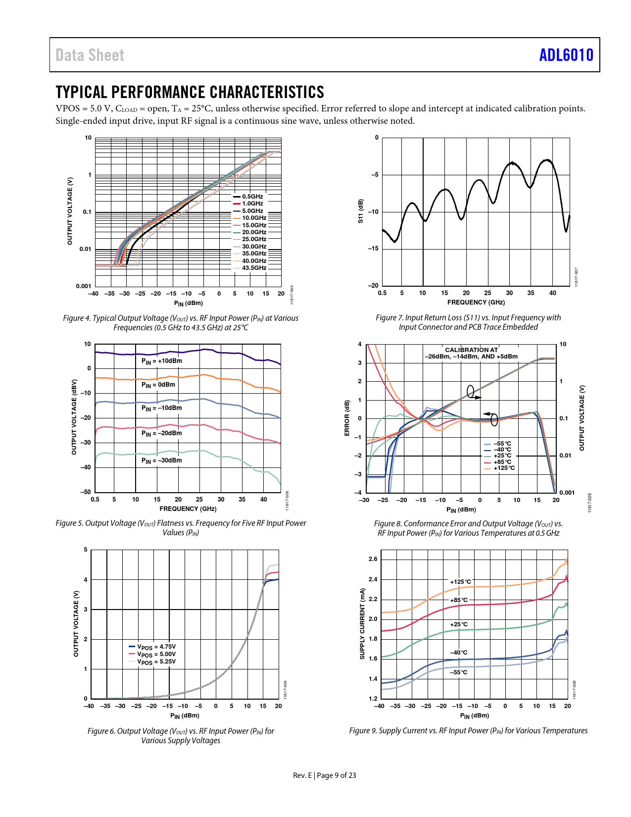 Data SheetADL6010TYPICAL PERFORMANCE CHARACTERISTICS VPOS = 5.0 V, CLOAD = open, TA = 25°C, unless otherwise specified. Error referred to slope and intercept at indicated calibration points. Single-ended input drive, input RF signal is a continuous sine wave, unless otherwise noted. 1001)–5V (GE0.5GHz 1.0GHzB) dOLTA0.15.0GHz–101 (10.0GHz1T VSU15.0GHzTP20.0GHz 25.0GHzOU0.0130.0GHz–1535.0GHz 40.0GHz 43.5GHz 007 0.001–20 1617- 1 003 –40–35 –30 –25 –20 –15 –10–5051015200.5510152025303540PFREQUENCY (GHz)IN (dBm) 11617- Figure 4. Typical Output Voltage (VOUT) vs. RF Input Power (PIN) at Various Figure 7. Input Return Loss (S11) vs. Input Frequency with Frequencies (0.5 GHz to 43.5 GHz) at 25°C Input Connector and PCB Trace Embedded 10410CALIBRATION AT–26dBm, –14dBm, AND +5dBmPIN = +10dBm30) V21PIN = 0dBmdB –10(1E (V)GEB)GPAIN = –10dBmdLT–20R (00.1OOLTAT VT VRROUUPIN = –20dBmE –1–30TPTP–55°C –40°COUOU–2+25°C0.01PIN = –30dBm+85°C–40+125°C–3–50–40.001 006 0.5510152025303540–30–25–20–15–10–505101520 009 FREQUENCY (GHz) 11617- PIN (dBm) 1617- 1 Figure 5. Output Voltage (VOUT) Flatness vs. Frequency for Five RF Input Power Figure 8. Conformance Error and Output Voltage (VOUT) vs. Values (PIN) RF Input Power (PIN) for Various Temperatures at 0.5 GHz 52.642.4+125°CmA) 2.2E (V)(+85°CG 3ANTLT2.0O+25°CT VCURREU 2Y 1.8LTPVPOS = 4.75VPPOUV–40°CPOS = 5.00VSUV1.6POS = 5.25V1–55°C1.4 004 005 1617- 0 1617- 1 1.2 1 –40–35 –30–25 –20–15 –10–505101520–40–35 –30–25 –20 –15 –10–505101520PIN (dBm)PIN (dBm) Figure 6. Output Voltage (VOUT) vs. RF Input Power (PIN) for Figure 9. Supply Current vs. RF Input Power (PIN) for Various Temperatures Various Supply Voltages Rev. E | Page 9 of 23 Document Outline FEATURES APPLICATIONS FUNCTIONAL BLOCK DIAGRAM GENERAL DESCRIPTION TABLE OF CONTENTS REVISION HISTORY SPECIFICATIONS ABSOLUTE MAXIMUM RATINGS ESD CAUTION PIN CONFIGURATIONS AND FUNCTION DESCRIPTIONS TYPICAL PERFORMANCE CHARACTERISTICS MEASUREMENT SETUPS THEORY OF OPERATION BASIC CONNECTIONS PCB LAYOUT RECOMMENDATIONS SYSTEM CALIBRATION AND ERROR CALCULATION EFFECT OF A CAPACITIVE LOAD ON RISE TIME AND FALL TIME EVALUATION BOARD EVALUATION BOARD ASSEMBLY DRAWINGS OUTLINE DIMENSIONS ORDERING GUIDE