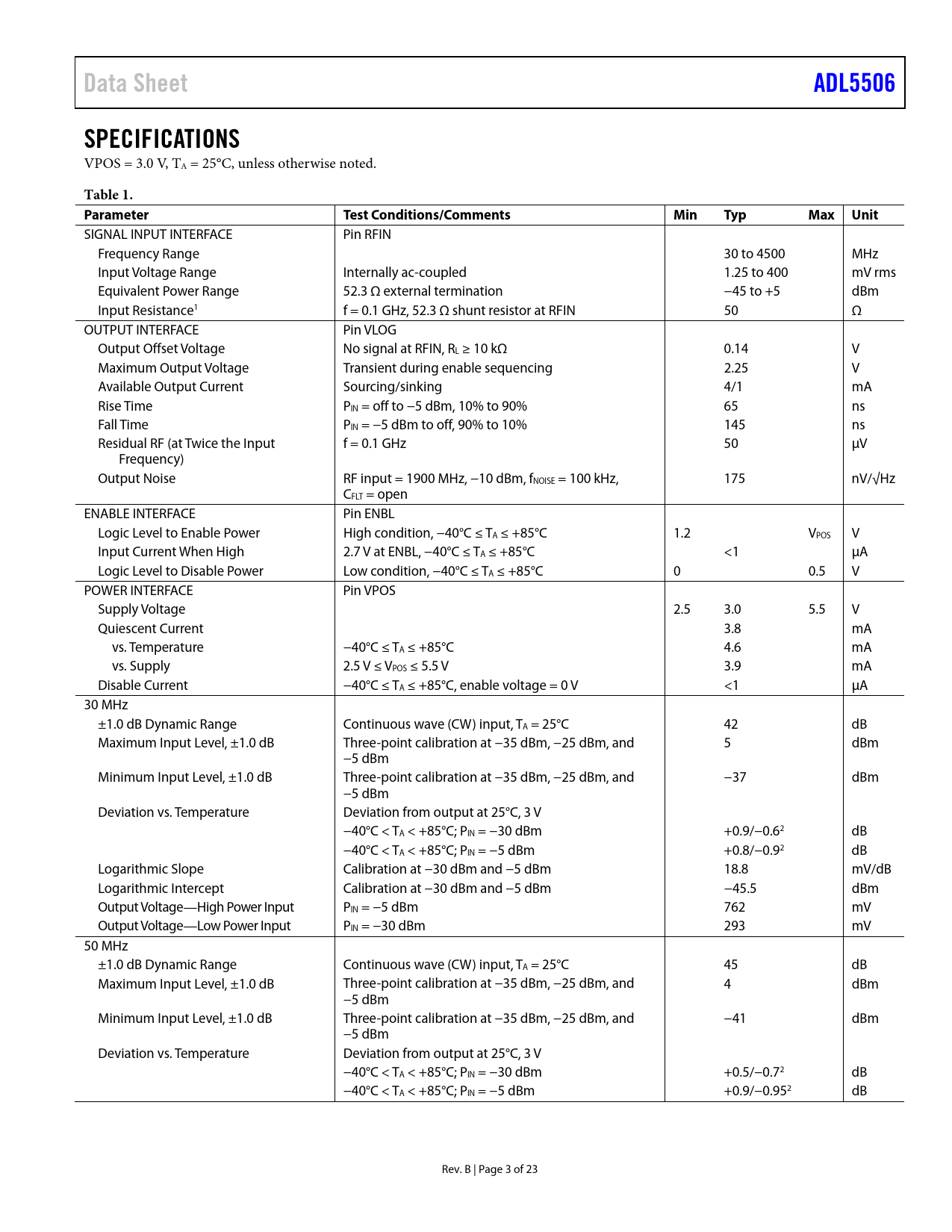 Páginas / Página23 / 3 — Data Sheet. ADL5506. SPECIFICATIONS. Table 1. Parameter Test. …