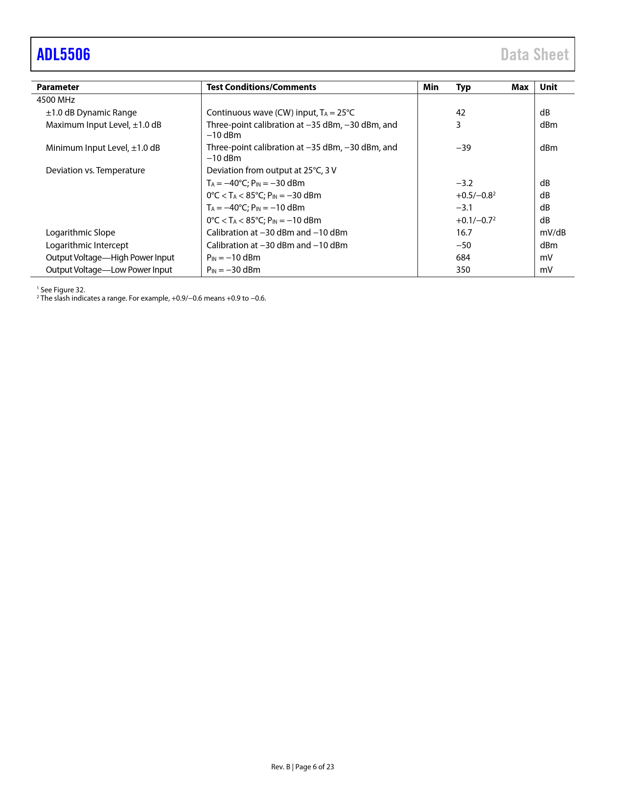 4500 MHz ±1.0 dB Dynamic Range Continuous wave (CW) input, TA = 25°C 42 dB Maximum Input Level, ±1.0 dB Three-point calibration at −35 dBm, −30 dBm, and 3 dBm −10 dBm Minimum Input Level, ±1.0 dB Three-point calibration at −35 dBm, −30 dBm, and −39 dBm −10 dBm Deviation vs. Temperature Deviation from output at 25°C, 3 V TA = −40°C; PIN = −30 dBm −3.2 dB 0°C < TA < 85°C; PIN = −30 dBm +0.5/−0.82 dB TA = −40°C; PIN = −10 dBm −3.1 dB 0°C < TA < 85°C; PIN = −10 dBm +0.1/−0.72 dB Logarithmic Slope Calibration at −30 dBm and −10 dBm 16.7 mV/dB Logarithmic Intercept Calibration at −30 dBm and −10 dBm −50 dBm Output Voltage—High Power Input PIN = −10 dBm 684 mV Output Voltage—Low Power Input PIN = −30 dBm 350 mV 1 See Figure 32. 2 The slash indicates a range. For example, +0.9/−0.6 means +0.9 to −0.6. Rev. B | Page 6 of 23 Document Outline FEATURES APPLICATIONS GENERAL DESCRIPTION FUNCTIONAL BLOCK DIAGRAM REVISION HISTORY SPECIFICATIONS ABSOLUTE MAXIMUM RATINGS ESD CAUTION PIN CONFIGURATION AND FUNCTION DESCRIPTIONS TYPICAL PERFORMANCE CHARACTERISTICS MEASUREMENT SETUPS THEORY OF OPERATION APPLICATIONS INFORMATION BASIC CONNECTIONS TRANSFER FUNCTION IN TERMS OF SLOPE AND INTERCEPT LOG CONFORMANCE ERROR CALCULATION Filter Capacitor Input Coupling Options Effect of Waveform Type on Intercept Temperature Drift at High Frequencies Operation Above 4.5 GHz VLOG Output Noise VLOG Pulse Response Time Device Handling EVALUATION BOARD LAND PATTERN AND SOLDERING INFORMATION OUTLINE DIMENSIONS ORDERING GUIDE AUTOMOTIVE PRODUCTS