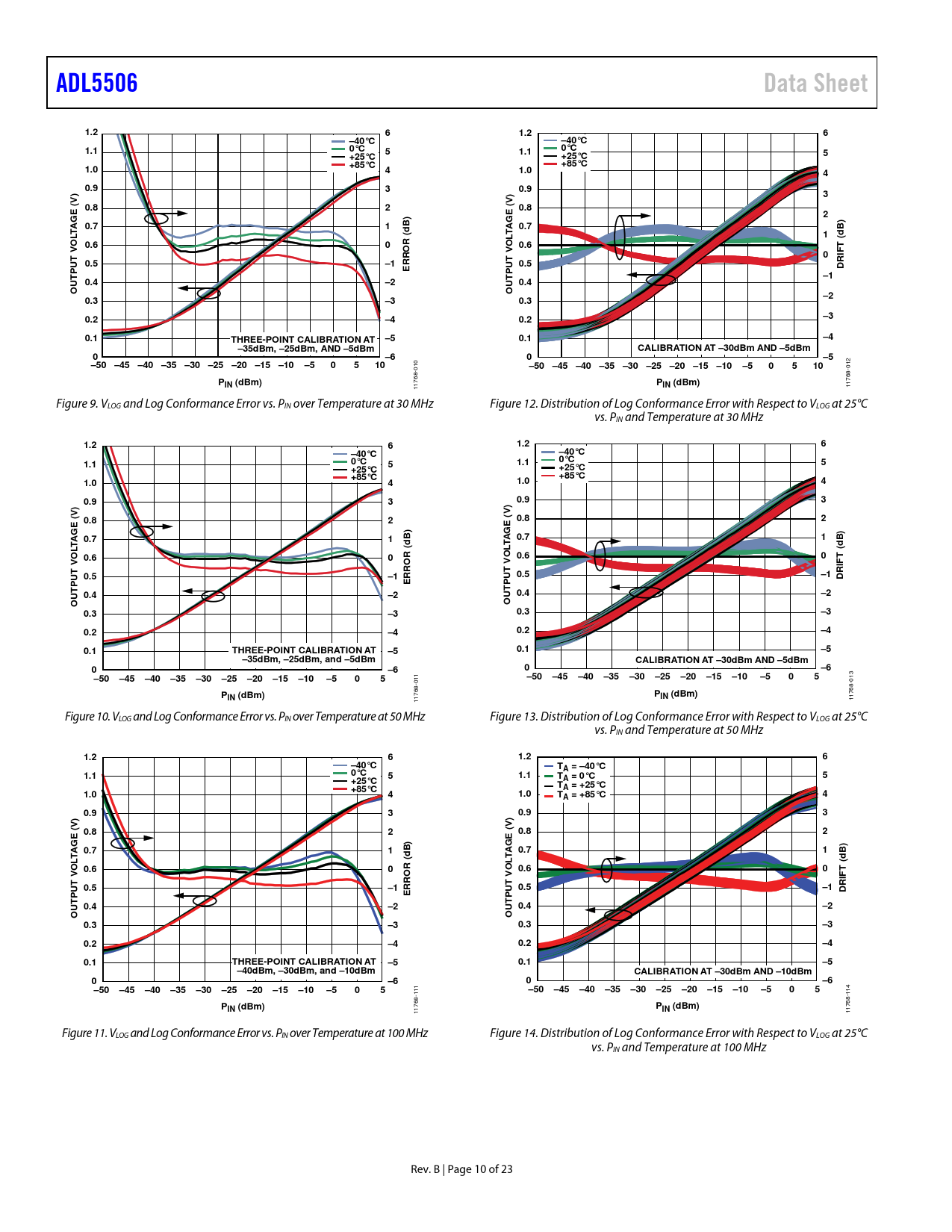 ADL5506Data Sheet1.261.26–40°C–40°C1.10°C51.10°C+25°C5+25°C+85°C+85°C1.041.040.930.930.820.8E (V)E (V)2GG)A 0.71B) dA 0.7LT1LTdBO 0.60R (O 0.6IFT (T V0T VRU 0.5–1RROU 0.5EDTPTP–10.4–20.4OUOU–20.3–30.30.2–40.2–30.1THREE-POINT CALIBRATION AT–50.1–4–35dBm, –25dBm, AND –5dBmCALIBRATION AT –30dBm AND –5dBm0–60–5–50 –45 –40 –35 –30 –25 –20 –15 –10–50510 010 –50 –45 –40 –35 –30 –25 –20 –15 –10–50510 012 PIN (dBm) 1768- P 1768- 1 IN (dBm) 1 Figure 9. VLOG and Log Conformance Error vs. PIN over Temperature at 30 MHz Figure 12. Distribution of Log Conformance Error with Respect to VLOG at 25°C vs. PIN and Temperature at 30 MHz 1.261.26–40°C–40°C0°C1.10°C51.15+25°C+25°C+85°C+85°C1.041.040.930.930.820.82E (V)E (V)GG)A 0.71B)A 0.71ddBLTLTO 0.60R (O 0.60IFT (T VT VRU 0.5–1RROU 0.5–1DETPTP0.4–20.4–2OUOU0.3–30.3–30.2–40.2–40.1THREE-POINT CALIBRATION AT–50.1–5–35dBm, –25dBm, and –5dBmCALIBRATION AT –30dBm AND –5dBm0–60–6–50–45–40–35–30–25–20–15–10–505 1 1 –50–45–40–35–30–25–20–15–10–505 0 013 PPIN (dBm) 1768- IN (dBm) 1768- 1 1 Figure 10. VLOG and Log Conformance Error vs. PIN over Temperature at 50 MHz Figure 13. Distribution of Log Conformance Error with Respect to VLOG at 25°C vs. PIN and Temperature at 50 MHz 1.261.26–40°CTA = –40°C1.10°C51.1T5+25°CA = 0°C+85°CTA = +25°C1.041.0T4A = +85°C0.930.930.820.82E (V)E (V)GG)A 0.71B) dA 0.71dBLTLTO 0.60R (O 0.60IFT (T VT VRU 0.5–1RROU 0.5–1EDTPTP0.4–20.4–2OUOU0.3–30.3–30.2–40.2–40.1THREE-POINT CALIBRATION AT–50.1–5–40dBm, –30dBm, and –10dBmCALIBRATION AT –30dBm AND –10dBm0–60–6–50–45–40–35–30–25–20–15–10–505 1 –50–45–40–35–30–25–20–15–10–505 14 11 1 PIN (dBm) 1768- P 1768- 1 IN (dBm) 1 Figure 11. VLOG and Log Conformance Error vs. PIN over Temperature at 100 MHz Figure 14. Distribution of Log Conformance Error with Respect to VLOG at 25°C vs. PIN and Temperature at 100 MHz Rev. B | Page 10 of 23 Document Outline FEATURES APPLICATIONS GENERAL DESCRIPTION FUNCTIONAL BLOCK DIAGRAM REVISION HISTORY SPECIFICATIONS ABSOLUTE MAXIMUM RATINGS ESD CAUTION PIN CONFIGURATION AND FUNCTION DESCRIPTIONS TYPICAL PERFORMANCE CHARACTERISTICS MEASUREMENT SETUPS THEORY OF OPERATION APPLICATIONS INFORMATION BASIC CONNECTIONS TRANSFER FUNCTION IN TERMS OF SLOPE AND INTERCEPT LOG CONFORMANCE ERROR CALCULATION Filter Capacitor Input Coupling Options Effect of Waveform Type on Intercept Temperature Drift at High Frequencies Operation Above 4.5 GHz VLOG Output Noise VLOG Pulse Response Time Device Handling EVALUATION BOARD LAND PATTERN AND SOLDERING INFORMATION OUTLINE DIMENSIONS ORDERING GUIDE AUTOMOTIVE PRODUCTS