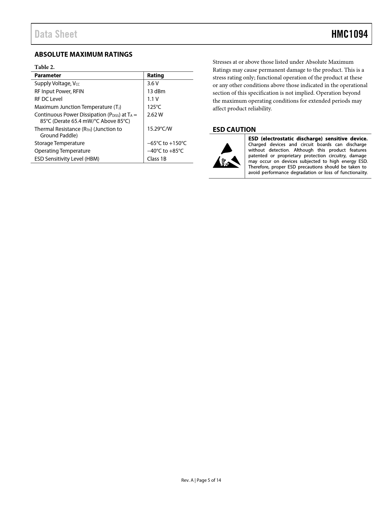 Data Sheet. HMC1094. ABSOLUTE MAXIMUM RATINGS. Table 2. Parameter. Rating. ESD CAUTION