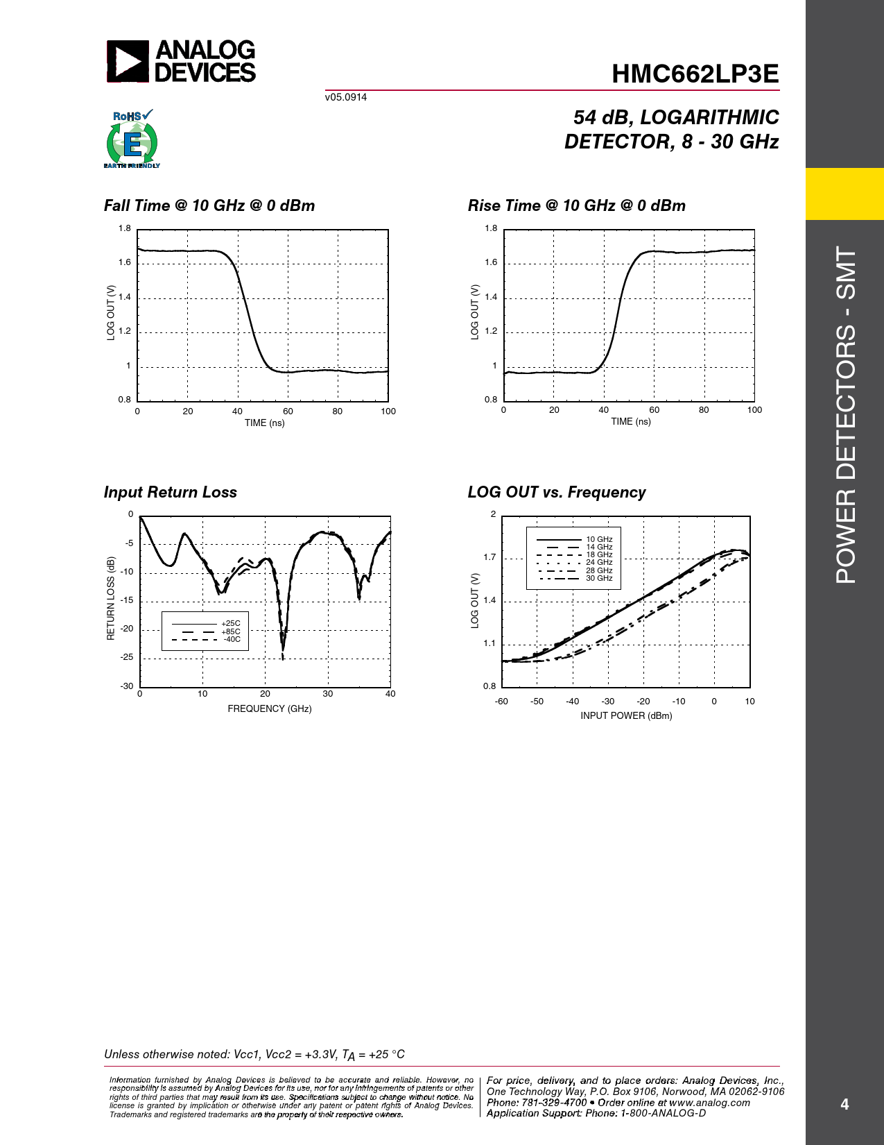 HMC662LP3E v05.0914 54 dB, LOGARITHMICDETECTOR, 8 - 30 GHzFall Time @ 10 GHz @ 0 dBmRise Time @ 10 GHz @ 0 dBm 1.8 1.8 1.6 1.6 T M (V) 1.4 (V) 1.4 S OUT OUT - 1.2 1.2 LOG LOG RS 1 1 O T 0.8 0.8 0 20 40 60 80 100 0 20 40 60 80 100 C TIME (ns) TIME (ns) TE E D Input Return LossLOG OUT vs. Frequency R 0 2 10 GHz -5 14 GHz WE 1.7 18 GHz 24 GHz (dB) -10 28 GHz O 30 GHz (V) P LOSS -15 1.4 OUT +25C LOG -20 +85C RETURN -40C 1.1 -25 -30 0.8 0 10 20 30 40 -60 -50 -40 -30 -20 -10 0 10 FREQUENCY (GHz) INPUT POWER (dBm) Unless otherwise noted: Vcc1, Vcc2 = +3.3V, TA = +25 °C I F nf o or r p mati r o in cfe ur , d nish e e l d iv b e y r A y a nalo n g d t Devi o p ces i la s c bele o ieve rd d t e o rbs e : H acc iutrtatite e M and ic reli rao bl w e. a H v o e C wever o , nrp o For price, delivery, and to place orders: Analog Devices, Inc., responsibility is assumed by Analog Devices for its use, nor for any infringements of patents or other oration, 2 Elizabeth Drive, Chelmsford, MA 01824 One Technology Way, P.O. Box 9106, Norwood, MA 02062-9106 Phone: 978-250-3343 • Fax: 978-250-3373 • O rights of third parties that may result from its use. Specifications subject to change without notice. No rd Ph e o r O ne n : 7 -l 81 i-n 3 e a 29-4t w 70 ww 0 • O .h rd iettit r o e nli.c n om license is granted by implication or otherwise under any patent or patent rights of Analog Devices. e at www.analog.com 4 Application Support: Pho Trademarks and registered trademarks are the property of their respective owners.ne: 978-250-33A4 p 3 p o lic ra a tiopp n S su@ p h po irtttit : Pe. hocnom e: 1-800-ANALOG-D
