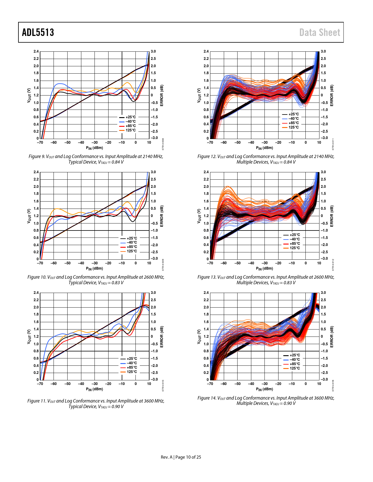 ADL5513Data Sheet2.43.02.43.02.22.52.22.52.02.02.02.01.81.51.81.51.61.01.61.01.40.5B)B)d1.40.5d(V)(V)1.20R (1.20R (UTUTOOV1.0–0.5RROV1.0–0.5RROEE0.8–1.00.8–1.0+25°C0.6+25°C–1.50.6–1.5–40°C–40°C0.4–2.0+85°C+85°C0.4–2.0125°C0.2125°C–2.50.2–2.50–3.00–3.0–70–60–50–40–30–20–10010 008 –70–60–50–40–30–20–10010 011 PIN (dBm)P 07514- IN (dBm) 07514- Figure 9. VOUT and Log Conformance vs. Input Amplitude at 2140 MHz, Figure 12. VOUT and Log Conformance vs. Input Amplitude at 2140 MHz, Typical Device, VTADJ = 0.84 V Multiple Devices, VTADJ = 0.84 V 2.43.02.43.02.22.52.22.52.02.02.02.01.81.51.81.51.61.01.61.01.40.5B)B)d1.40.5d(V)(V)1.20R (1.20R (UTUTOOV1.0–0.5RROV1.0–0.5RROEE0.8–1.00.8–1.0+25°C0.6+25°C–1.50.6–1.5–40°C–40°C0.4–2.00.4+85°C–2.0+85°C125°C0.2125°C–2.50.2–2.50–3.00–3.0–70–60–50–40–30–20–10010 009 –70–60–50–40–30–20–10010 012 PIN (dBm)P 07514- IN (dBm) 07514- Figure 10. VOUT and Log Conformance vs. Input Amplitude at 2600 MHz, Figure 13. VOUT and Log Conformance vs. Input Amplitude at 2600 MHz, Typical Device, VTADJ = 0.83 V Multiple Devices, VTADJ = 0.83 V 2.43.02.43.02.22.52.22.52.02.02.02.01.81.51.81.51.61.01.61.01.40.5B)B)d1.40.5d(V)(V)1.20R (1.20R (UTUTOOV1.0–0.5RROV1.0–0.5RROEE0.8–1.00.8–1.0+25°C0.6+25°C–1.50.6–1.5–40°C–40°C0.4–2.00.4+85°C–2.0+85°C125°C0.2125°C–2.50.2–2.50–3.00–3.0–70–60–50–40–30–20–10010 013 –70–60–50–40–30–20–10010 016 PIN (dBm)P 07514- IN (dBm) 07514- Figure 14. V Figure 11. V OUT and Log Conformance vs. Input Amplitude at 3600 MHz, OUT and Log Conformance vs. Input Amplitude at 3600 MHz, Multiple Devices, V Typical Device, V TADJ = 0.90 V TADJ = 0.90 V Rev. A | Page 10 of 25 Document Outline Features Applications Functional Block Diagram General Description Table of Contents Revision History Specifications Absolute Maximum Ratings ESD Caution Pin Configuration and Function Descriptions Typical Performance Characteristics Theory of Operation Applications Information Basic Connections Input Signal Coupling Output Filtering Output Interface Setpoint Interface Description of Characterization Error Calculations Adjusting Accuracy Through Choice of Calibration Points Temperature Compensation of Output Voltage Device Calibration Power-Down Functionality Measurement Mode Setting the Output Slope in Measurement Mode Controller Mode Constant Power Operation Increasing the Dynamic Range of the ADL5513 Evaluation Board Outline Dimensions Ordering Guide