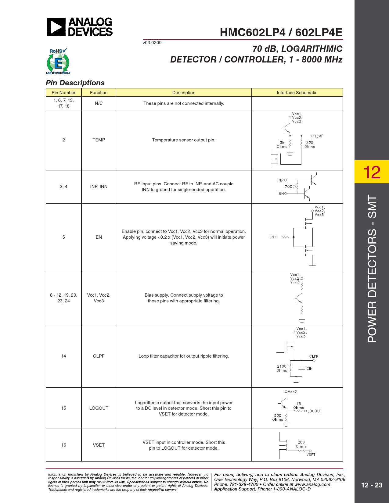 HMC602LP4 / 602LP4E. 70 dB, LOGARITHMIC. DETECTOR / CONTROLLER, 1 - 8000 MHz. Pin Descriptions. 12 - 23