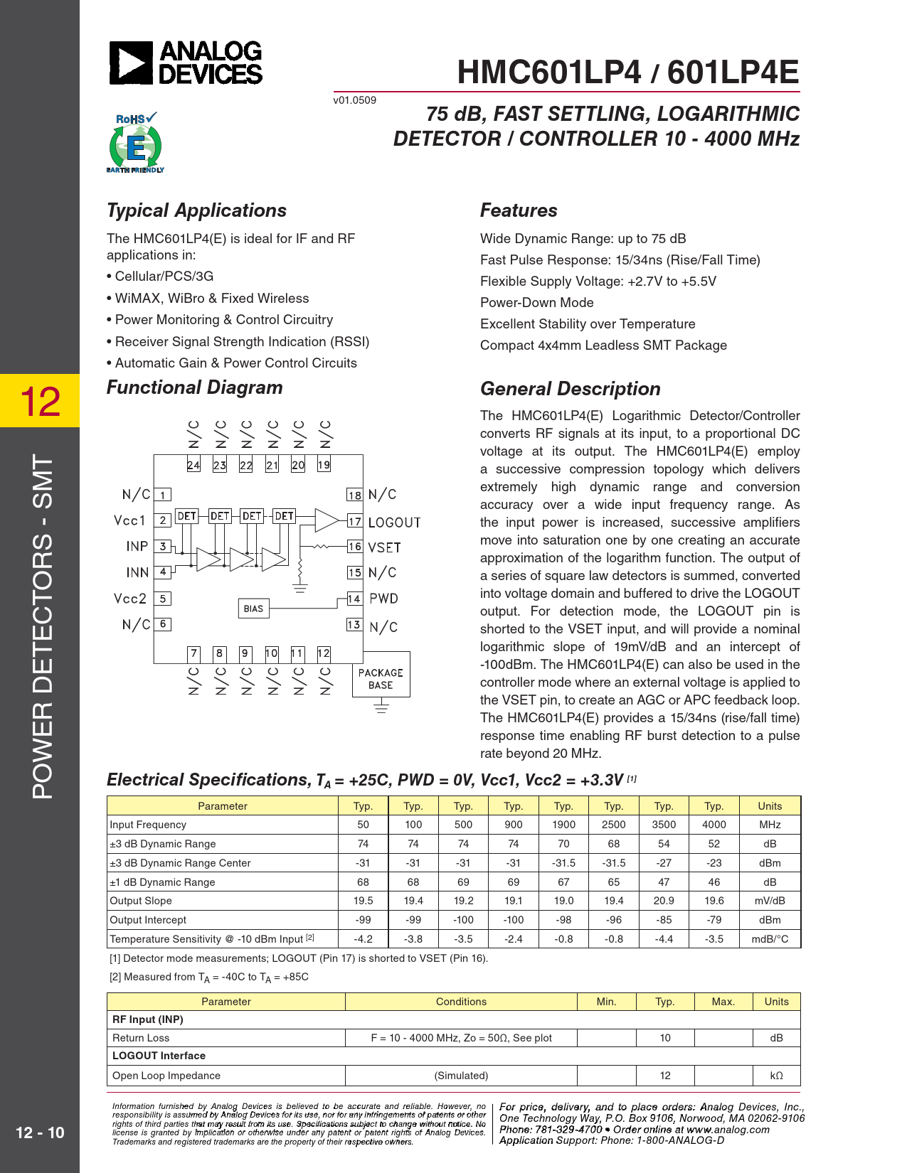 HMC601LP4 / 601LP4E v01.0509 75 dB, FAST SETTLING, LOGARITHMICDETECTOR / CONTROLLER 10 - 4000 MHzTypical ApplicationsFeatures The HMC601LP4(E) is ideal for IF and RF Wide Dynamic Range: up to 75 dB applications in: Fast Pulse Response: 15/34ns (Rise/Fall Time) • Cellular/PCS/3G Flexible Supply Voltage: +2.7V to +5.5V • WiMAX, WiBro & Fixed Wireless Power-Down Mode • Power Monitoring & Control Circuitry Excellent Stability over Temperature • Receiver Signal Strength Indication (RSSI) Compact 4x4mm Leadless SMT Package • Automatic Gain & Power Control Circuits 12 Functional DiagramGeneral Description The HMC601LP4(E) Logarithmic Detector/Controller converts RF signals at its input, to a proportional DC T voltage at its output. The HMC601LP4(E) employ a successive compression topology which delivers extremely high dynamic range and conversion accuracy over a wide input frequency range. As the input power is increased, successive amplifi ers S - SM move into saturation one by one creating an accurate R approximation of the logarithm function. The output of O a series of square law detectors is summed, converted T into voltage domain and buffered to drive the LOGOUT C output. For detection mode, the LOGOUT pin is E shorted to the VSET input, and will provide a nominal T logarithmic slope of 19mV/dB and an intercept of E -100dBm. The HMC601LP4(E) can also be used in the controller mode where an external voltage is applied to the VSET pin, to create an AGC or APC feedback loop. R D The HMC601LP4(E) provides a 15/34ns (rise/fall time) E response time enabling RF burst detection to a pulse W rate beyond 20 MHz. O Electrical Specifi cations, P TA = +25C, PWD = 0V, Vcc1, Vcc2 = +3.3V [1] Parameter Typ. Typ. Typ. Typ. Typ. Typ. Typ. Typ. Units Input Frequency 50 100 500 900 1900 2500 3500 4000 MHz ±3 dB Dynamic Range 74 74 74 74 70 68 54 52 dB ±3 dB Dynamic Range Center -31 -31 -31 -31 -31.5 -31.5 -27 -23 dBm ±1 dB Dynamic Range 68 68 69 69 67 65 47 46 dB Output Slope 19.5 19.4 19.2 19.1 19.0 19.4 20.9 19.6 mV/dB Output Intercept -99 -99 -100 -100 -98 -96 -85 -79 dBm Temperature Sensitivity @ -10 dBm Input [2] -4.2 -3.8 -3.5 -2.4 -0.8 -0.8 -4.4 -3.5 mdB/°C [1] Detector mode measurements; LOGOUT (Pin 17) is shorted to VSET (Pin 16). [2] Measured from TA = -40C to TA = +85C Parameter Conditions Min. Typ. Max. Units RF Input (INP) Return Loss F = 10 - 4000 MHz, Zo = 50Ω, See plot 10 dB LOGOUT Interface Open Loop Impedance (Simulated) 12 kΩ Information furnis F heod r pri by An ce, de alog Devi lcievs eir s y b , a eliev nd to pla ed to be accu ce o rate anrder d relia sbl, pl e. H ease co owever, no For price, delivery, and to place orders: Analog Devices, Inc., responsibility is assumed by Analog Devices for its use, nor for any infringements of patents or other ntact Hittite Microwave Corporation: One Technology Way, P.O. Box 9106, Norwood, MA 02062-9106 20 Alpha Road, Chelmsford, MA 01824 Phone: 978 rights of third parties that may result from its use. Specifications subject to change without notice. No Ph - o 25 ne 0 : 7 -3 81- 3 3 4 29 3 F -470 ax: 978 0 • Orde - r o 25 nlin 0- e a3 t 373 12 - 10 license is granted by implication or otherwise under any patent or patent rights of Analog Devices. www.analog.com Order On-l Trademarks and registered trademarks are the property of their respective owners. ine at www.hit A ti p te.co plicati m on Support: Phone: 1-800-ANALOG-D
