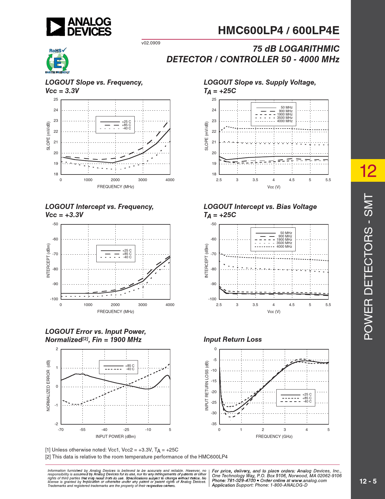 HMC600LP4 / 600LP4E. 75 dB LOGARITHMIC. DETECTOR / CONTROLLER 50 - 4000 MHz. LOGOUT Slope vs. Frequency,
