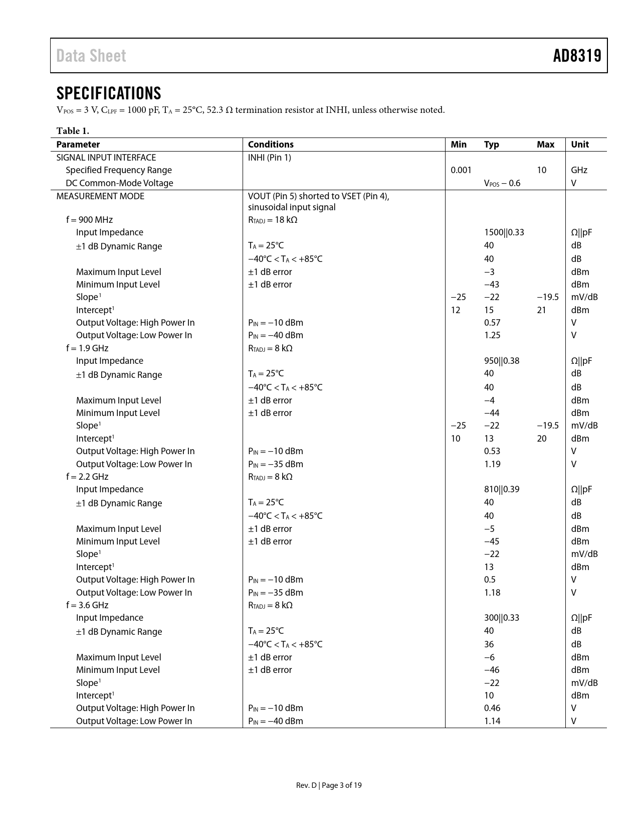 link to page 4 link to page 4 link to page 4 link to page 4 link to page 4 link to page 4 link to page 4 link to page 4 Data SheetAD8319SPECIFICATIONS VPOS = 3 V, CLPF = 1000 pF, TA = 25°C, 52.3 Ω termination resistor at INHI, unless otherwise noted. Table 1. ParameterConditionsMinTypMaxUnit SIGNAL INPUT INTERFACE INHI (Pin 1) Specified Frequency Range 0.001 10 GHz DC Common-Mode Voltage VPOS − 0.6 V MEASUREMENT MODE VOUT (Pin 5) shorted to VSET (Pin 4), sinusoidal input signal f = 900 MHz RTADJ = 18 kΩ Input Impedance 1500||0.33 Ω||pF ±1 dB Dynamic Range TA = 25°C 40 dB −40°C < TA < +85°C 40 dB Maximum Input Level ±1 dB error −3 dBm Minimum Input Level ±1 dB error −43 dBm Slope1 −25 −22 −19.5 mV/dB Intercept1 12 15 21 dBm Output Voltage: High Power In PIN = −10 dBm 0.57 V Output Voltage: Low Power In PIN = −40 dBm 1.25 V f = 1.9 GHz RTADJ = 8 kΩ Input Impedance 950||0.38 Ω||pF ±1 dB Dynamic Range TA = 25°C 40 dB −40°C < TA < +85°C 40 dB Maximum Input Level ±1 dB error −4 dBm Minimum Input Level ±1 dB error −44 dBm Slope1 −25 −22 −19.5 mV/dB Intercept1 10 13 20 dBm Output Voltage: High Power In PIN = −10 dBm 0.53 V Output Voltage: Low Power In PIN = −35 dBm 1.19 V f = 2.2 GHz RTADJ = 8 kΩ Input Impedance 810||0.39 Ω||pF ±1 dB Dynamic Range TA = 25°C 40 dB −40°C < TA < +85°C 40 dB Maximum Input Level ±1 dB error −5 dBm Minimum Input Level ±1 dB error −45 dBm Slope1 −22 mV/dB Intercept1 13 dBm Output Voltage: High Power In PIN = −10 dBm 0.5 V Output Voltage: Low Power In PIN = −35 dBm 1.18 V f = 3.6 GHz RTADJ = 8 kΩ Input Impedance 300||0.33 Ω||pF ±1 dB Dynamic Range TA = 25°C 40 dB −40°C < TA < +85°C 36 dB Maximum Input Level ±1 dB error −6 dBm Minimum Input Level ±1 dB error −46 dBm Slope1 −22 mV/dB Intercept1 10 dBm Output Voltage: High Power In PIN = −10 dBm 0.46 V Output Voltage: Low Power In PIN = −40 dBm 1.14 V Rev. D | Page 3 of 19 Document Outline FEATURES APPLICATIONS FUNCTIONAL BLOCK DIAGRAM GENERAL DESCRIPTION TABLE OF CONTENTS REVISION HISTORY SPECIFICATIONS ABSOLUTE MAXIMUM RATINGS ESD CAUTION PIN CONFIGURATION AND FUNCTION DESCRIPTIONS TYPICAL PERFORMANCE CHARACTERISTICS THEORY OF OPERATION USING THE AD8319 BASIC CONNECTIONS INPUT SIGNAL COUPLING OUTPUT INTERFACE SETPOINT INTERFACE TEMPERATURE COMPENSATION OF OUTPUT VOLTAGE MEASUREMENT MODE SETTING THE OUTPUT SLOPE IN MEASUREMENT MODE CONTROLLER MODE OUTPUT FILTERING OPERATION BEYOND 8 GHz EVALUATION BOARD OUTLINE DIMENSIONS ORDERING GUIDE