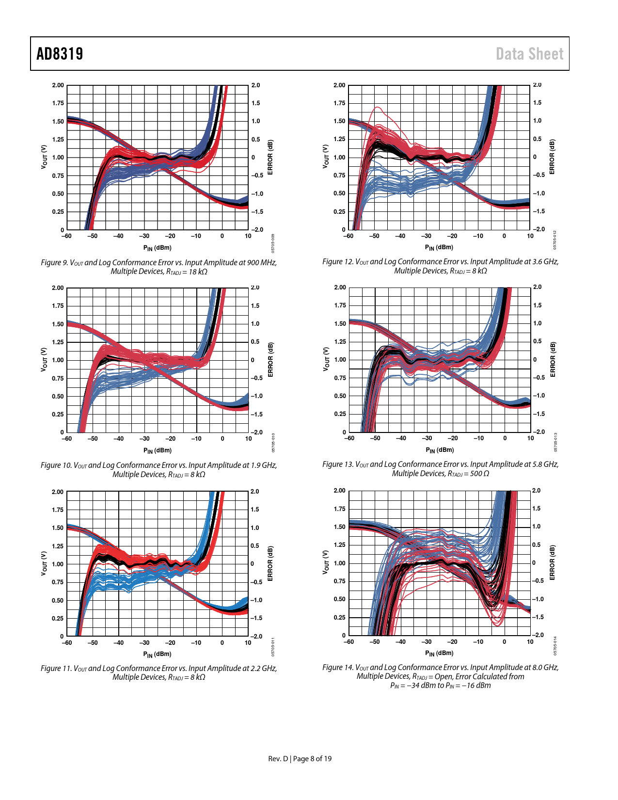 05705- Figure 10. VOUT and Log Conformance Error vs. Input Amplitude at 1.9 GHz, Figure 13. VOUT and Log Conformance Error vs. Input Amplitude at 5.8 GHz, Multiple Devices, RTADJ = 8 kΩ Multiple Devices, RTADJ = 500 Ω