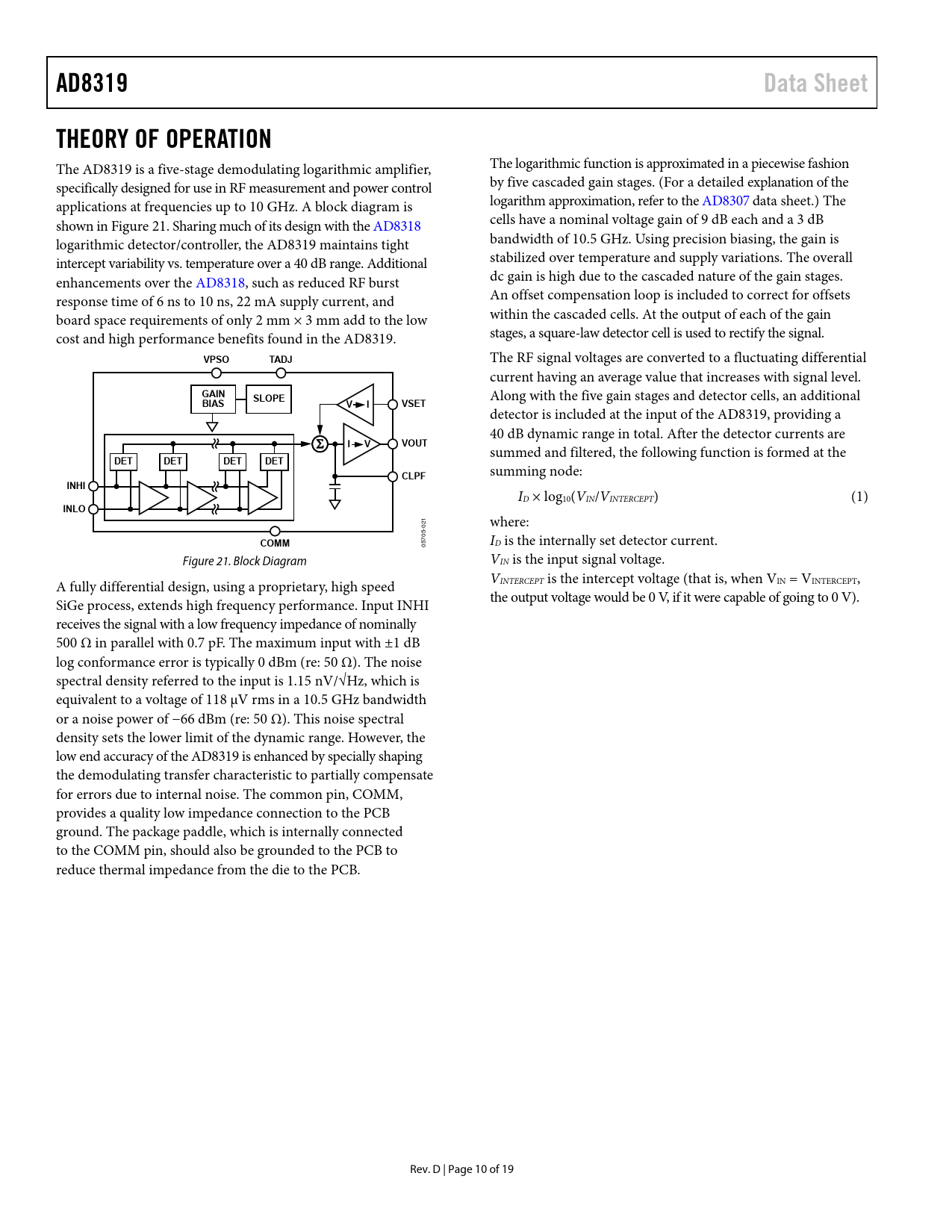 link to page 10 AD8319Data SheetTHEORY OF OPERATION The AD8319 is a five-stage demodulating logarithmic amplifier, The logarithmic function is approximated in a piecewise fashion specifically designed for use in RF measurement and power control by five cascaded gain stages. (For a detailed explanation of the applications at frequencies up to 10 GHz. A block diagram is logarithm approximation, refer to the AD8307 data sheet.) The shown in Figure 21. Sharing much of its design with the AD8318 cells have a nominal voltage gain of 9 dB each and a 3 dB logarithmic detector/controller, the AD8319 maintains tight bandwidth of 10.5 GHz. Using precision biasing, the gain is intercept variability vs. temperature over a 40 dB range. Additional stabilized over temperature and supply variations. The overall enhancements over the AD8318, such as reduced RF burst dc gain is high due to the cascaded nature of the gain stages. response time of 6 ns to 10 ns, 22 mA supply current, and An offset compensation loop is included to correct for offsets board space requirements of only 2 mm × 3 mm add to the low within the cascaded cells. At the output of each of the gain cost and high performance benefits found in the AD8319. stages, a square-law detector cell is used to rectify the signal. VPSOTADJ The RF signal voltages are converted to a fluctuating differential current having an average value that increases with signal level. GAIN Along with the five gain stages and detector cells, an additional BIASSLOPEVIVSET detector is included at the input of the AD8319, providing a 40 dB dynamic range in total. After the detector currents are IVVOUT summed and filtered, the following function is formed at the DETDETDETDETCLPF summing node: INHI ID × log10(VIN/VINTERCEPT) (1) INLO 21 where: 0 5- COMM 570 I 0 D is the internally set detector current. Figure 21. Block Diagram VIN is the input signal voltage. V A fully differential design, using a proprietary, high speed INTERCEPT is the intercept voltage (that is, when VIN = VINTERCEPT, the output voltage would be 0 V, if it were capable of going to 0 V). SiGe process, extends high frequency performance. Input INHI receives the signal with a low frequency impedance of nominally 500 Ω in parallel with 0.7 pF. The maximum input with ±1 dB log conformance error is typically 0 dBm (re: 50 Ω). The noise spectral density referred to the input is 1.15 nV/√Hz, which is equivalent to a voltage of 118 μV rms in a 10.5 GHz bandwidth or a noise power of −66 dBm (re: 50 Ω). This noise spectral density sets the lower limit of the dynamic range. However, the low end accuracy of the AD8319 is enhanced by specially shaping the demodulating transfer characteristic to partially compensate for errors due to internal noise. The common pin, COMM, provides a quality low impedance connection to the PCB ground. The package paddle, which is internally connected to the COMM pin, should also be grounded to the PCB to reduce thermal impedance from the die to the PCB. Rev. D | Page 10 of 19 Document Outline FEATURES APPLICATIONS FUNCTIONAL BLOCK DIAGRAM GENERAL DESCRIPTION TABLE OF CONTENTS REVISION HISTORY SPECIFICATIONS ABSOLUTE MAXIMUM RATINGS ESD CAUTION PIN CONFIGURATION AND FUNCTION DESCRIPTIONS TYPICAL PERFORMANCE CHARACTERISTICS THEORY OF OPERATION USING THE AD8319 BASIC CONNECTIONS INPUT SIGNAL COUPLING OUTPUT INTERFACE SETPOINT INTERFACE TEMPERATURE COMPENSATION OF OUTPUT VOLTAGE MEASUREMENT MODE SETTING THE OUTPUT SLOPE IN MEASUREMENT MODE CONTROLLER MODE OUTPUT FILTERING OPERATION BEYOND 8 GHz EVALUATION BOARD OUTLINE DIMENSIONS ORDERING GUIDE