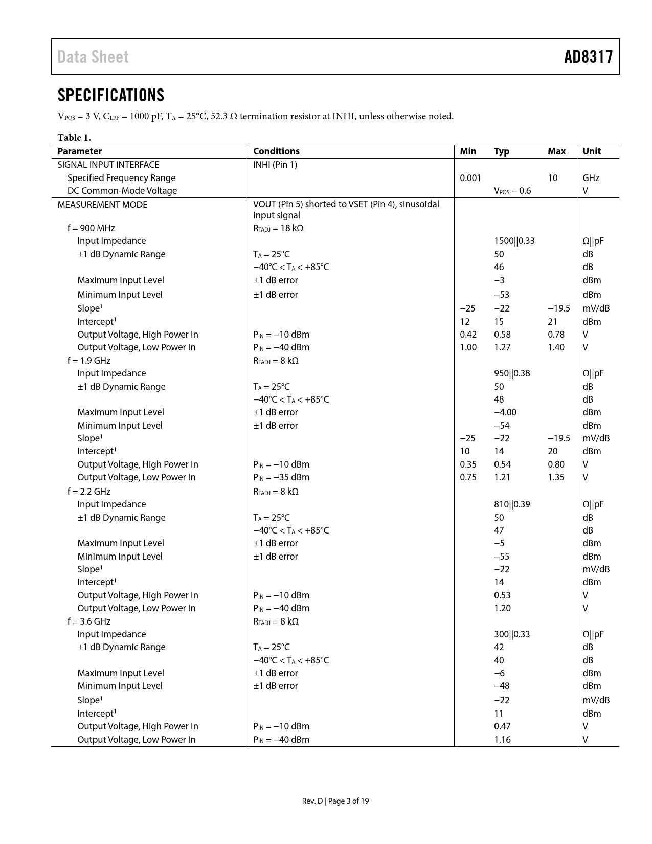 Data Sheet AD8317 SPECIFICATIONS Table 1 Parameter Conditions Min Typ Max Unit