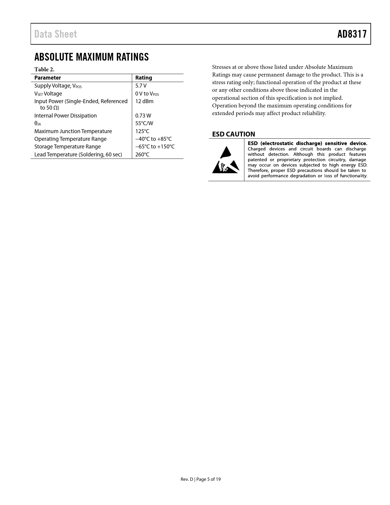 Data Sheet. AD8317. ABSOLUTE MAXIMUM RATINGS Table 2. Parameter Rating. ESD CAUTION