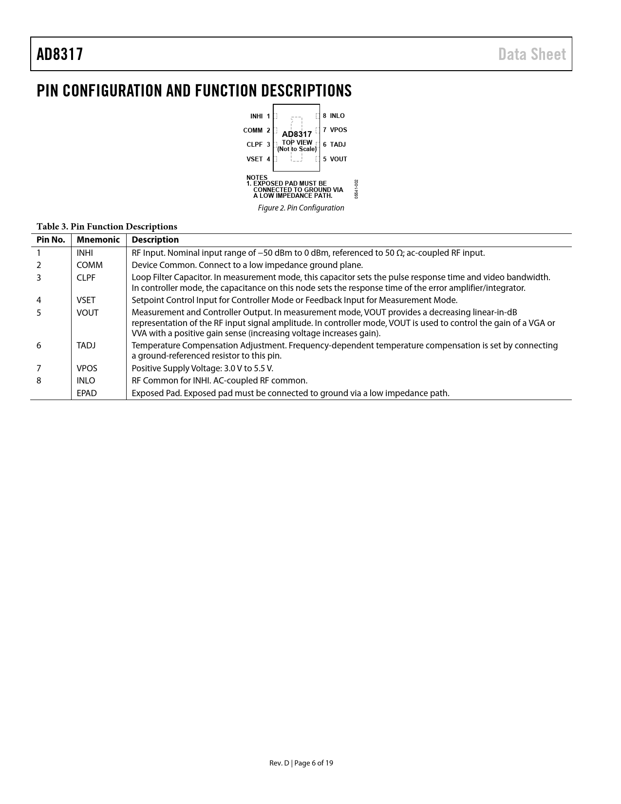 AD8317 Data Sheet PIN CONFIGURATION AND FUNCTION DESCRIPTIONS INHI 1 8 INLO COMM 2 7 VPOS AD8317 CLPF 3 TOP VIEW 6 TADJ (Not to Scale) VSET 4 5 VOUT NOTES 1. EXPOSED PAD MUST BE