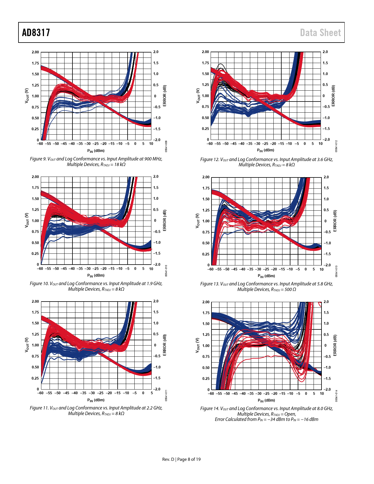 05 Figure 10. VOUT and Log Conformance vs. Input Amplitude at 1.9 GHz, Figure 13. VOUT and Log Conformance vs. Input Amplitude at 5.8 GHz, Multiple Devices, RTADJ = 8 kΩ Multiple Devices, RTADJ = 500 Ω