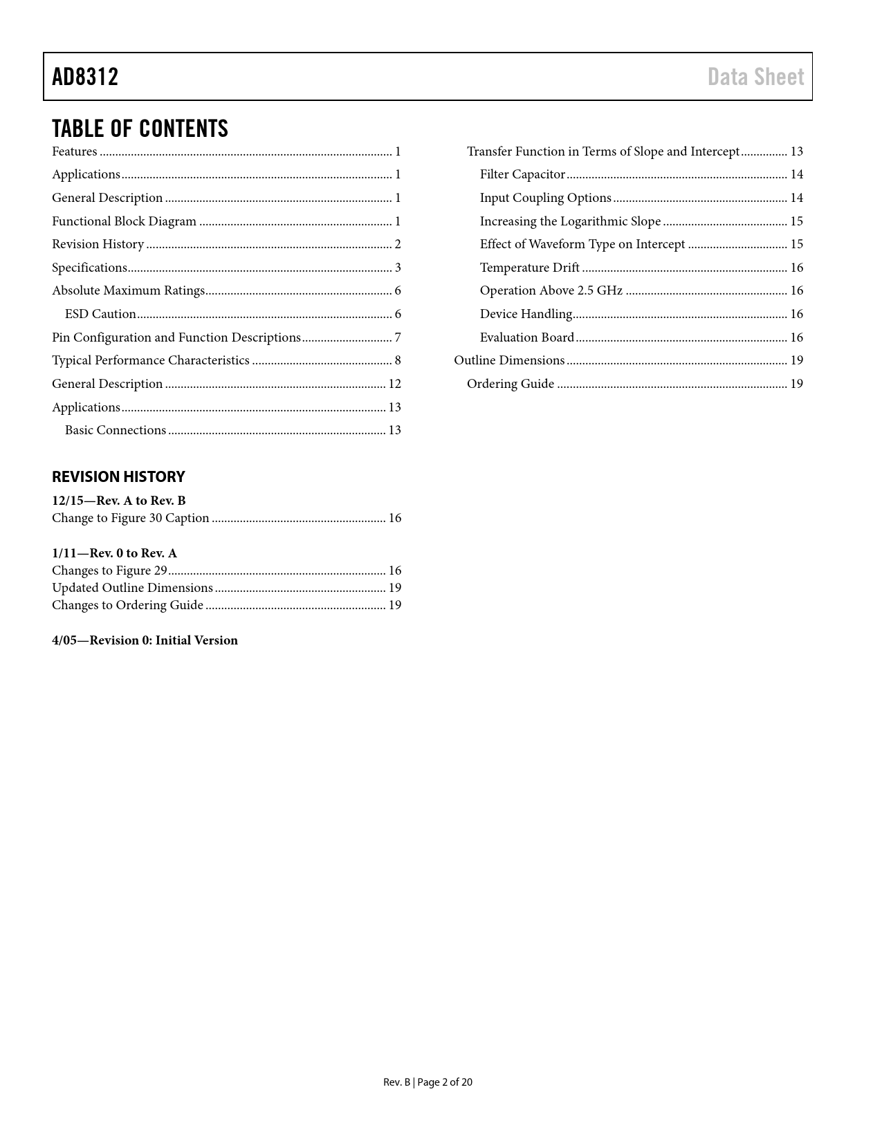 AD8312 Data Sheet TABLE OF CONTENTS REVISION HISTORY 12/15—Rev A to Rev B 1/11—Rev 0 to Rev A
