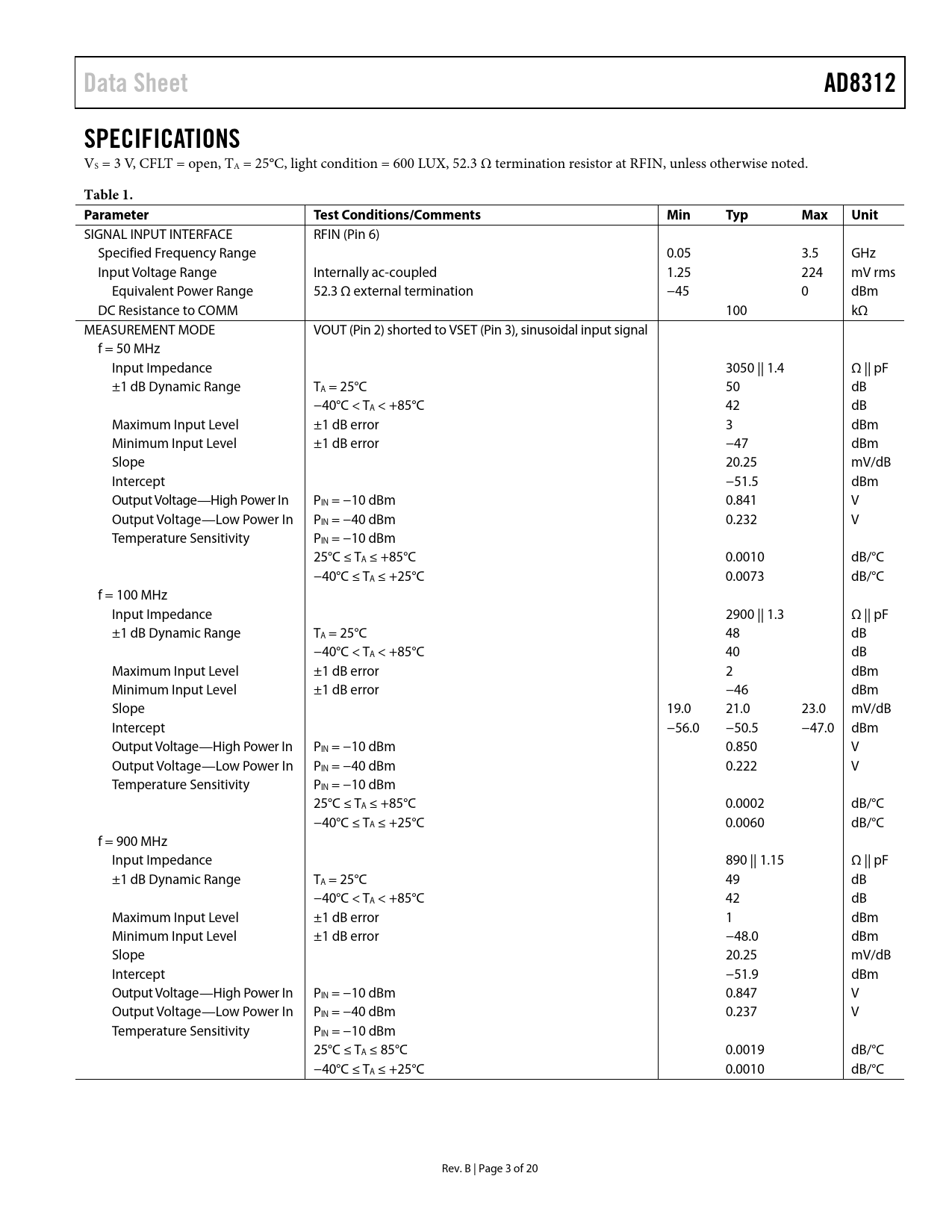 SIGNAL INPUT INTERFACE RFIN (Pin 6) Specified Frequency Range 0.05 3.5 GHz Input Voltage Range Internally ac-coupled 1.25 224 mV rms Equivalent Power Range 52.3 Ω external termination −45 0 dBm DC Resistance to COMM 100 kΩ MEASUREMENT MODE VOUT (Pin 2) shorted to VSET (Pin 3), sinusoidal input signal f = 50 MHz Input Impedance 3050 || 1.4 Ω || pF ±1 dB Dynamic Range TA = 25°C 50 dB −40°C < TA < +85°C 42 dB Maximum Input Level ±1 dB error 3 dBm Minimum Input Level ±1 dB error −47 dBm Slope 20.25 mV/dB Intercept −51.5 dBm Output Voltage—High Power In PIN = −10 dBm 0.841 V Output Voltage—Low Power In PIN = −40 dBm 0.232 V Temperature Sensitivity PIN = −10 dBm 25°C ≤ TA ≤ +85°C 0.0010 dB/°C −40°C ≤ TA ≤ +25°C 0.0073 dB/°C f = 100 MHz Input Impedance 2900 || 1.3 Ω || pF ±1 dB Dynamic Range TA = 25°C 48 dB −40°C < TA < +85°C 40 dB Maximum Input Level ±1 dB error 2 dBm Minimum Input Level ±1 dB error −46 dBm Slope 19.0 21.0 23.0 mV/dB Intercept −56.0 −50.5 −47.0 dBm Output Voltage—High Power In PIN = −10 dBm 0.850 V Output Voltage—Low Power In PIN = −40 dBm 0.222 V Temperature Sensitivity PIN = −10 dBm 25°C ≤ TA ≤ +85°C 0.0002 dB/°C −40°C ≤ TA ≤ +25°C 0.0060 dB/°C f = 900 MHz Input Impedance 890 || 1.15 Ω || pF ±1 dB Dynamic Range TA = 25°C 49 dB −40°C < TA < +85°C 42 dB Maximum Input Level ±1 dB error 1 dBm Minimum Input Level ±1 dB error −48.0 dBm Slope 20.25 mV/dB Intercept −51.9 dBm Output Voltage—High Power In PIN = −10 dBm 0.847 V Output Voltage—Low Power In PIN = −40 dBm 0.237 V Temperature Sensitivity PIN = −10 dBm 25°C ≤ TA ≤ 85°C 0.0019 dB/°C −40°C ≤ TA ≤ +25°C 0.0010 dB/°C Rev. B | Page 3 of 20 Document Outline FEATURES APPLICATIONS GENERAL DESCRIPTION FUNCTIONAL BLOCK DIAGRAM REVISION HISTORY SPECIFICATIONS ABSOLUTE MAXIMUM RATINGS ESD CAUTION PIN CONFIGURATION AND FUNCTION DESCRIPTIONS TYPICAL PERFORMANCE CHARACTERISTICS GENERAL DESCRIPTION APPLICATIONS INFORMATION BASIC CONNECTIONS TRANSFER FUNCTION IN TERMS OF SLOPE AND INTERCEPT Filter Capacitor Input Coupling Options Increasing the Logarithmic Slope Effect of Waveform Type on Intercept Temperature Drift Operation Above 2.5 GHz Device Handling Evaluation Board OUTLINE DIMENSIONS ORDERING GUIDE