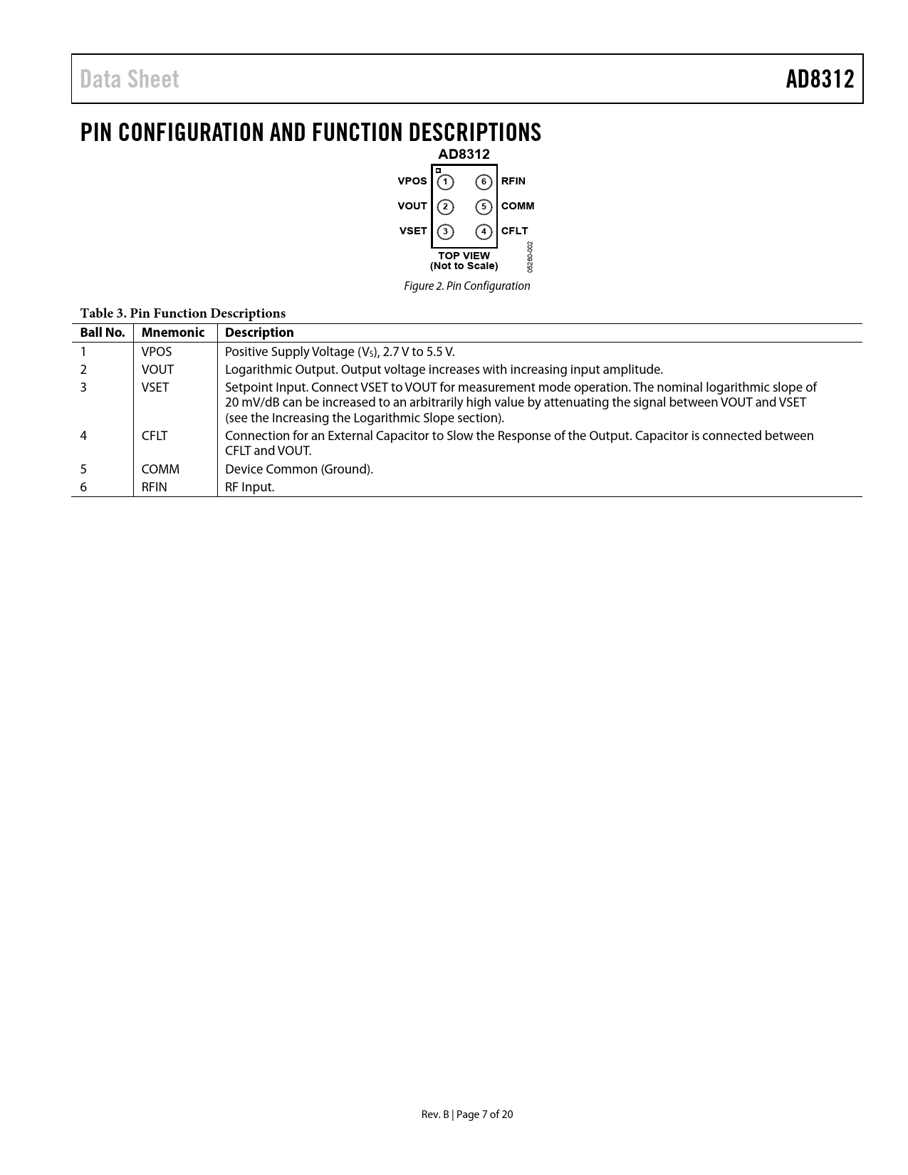 link to page 15 Data SheetAD8312PIN CONFIGURATION AND FUNCTION DESCRIPTIONSAD8312VPOS16RFINVOUT25COMMVSET34CFLTTOP VIEW(Not to Scale) 05260-002 Figure 2. Pin Configuration Table 3. Pin Function Descriptions Ball No. MnemonicDescription 1 VPOS Positive Supply Voltage (VS), 2.7 V to 5.5 V. 2 VOUT Logarithmic Output. Output voltage increases with increasing input amplitude. 3 VSET Setpoint Input. Connect VSET to VOUT for measurement mode operation. The nominal logarithmic slope of 20 mV/dB can be increased to an arbitrarily high value by attenuating the signal between VOUT and VSET (see the Increasing the Logarithmic Slope section). 4 CFLT Connection for an External Capacitor to Slow the Response of the Output. Capacitor is connected between CFLT and VOUT. 5 COMM Device Common (Ground). 6 RFIN RF Input. Rev. B | Page 7 of 20 Document Outline FEATURES APPLICATIONS GENERAL DESCRIPTION FUNCTIONAL BLOCK DIAGRAM REVISION HISTORY SPECIFICATIONS ABSOLUTE MAXIMUM RATINGS ESD CAUTION PIN CONFIGURATION AND FUNCTION DESCRIPTIONS TYPICAL PERFORMANCE CHARACTERISTICS GENERAL DESCRIPTION APPLICATIONS INFORMATION BASIC CONNECTIONS TRANSFER FUNCTION IN TERMS OF SLOPE AND INTERCEPT Filter Capacitor Input Coupling Options Increasing the Logarithmic Slope Effect of Waveform Type on Intercept Temperature Drift Operation Above 2.5 GHz Device Handling Evaluation Board OUTLINE DIMENSIONS ORDERING GUIDE