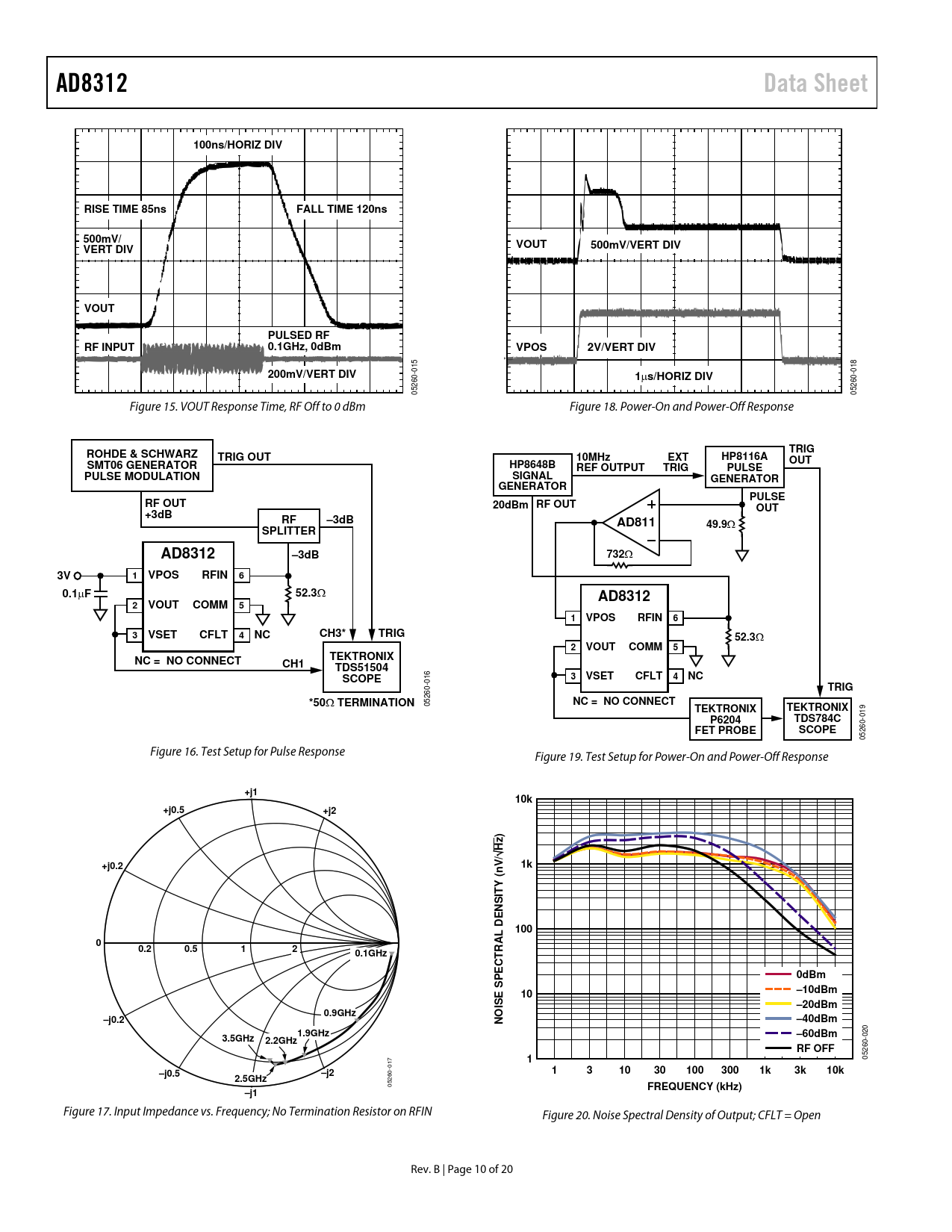 AD8312Data Sheet100ns/HORIZ DIVRISE TIME 85nsFALL TIME 120ns500mV/VOUTVERT DIV500mV/VERT DIVVOUTPULSED RFRF INPUT0.1GHz, 0dBmVPOS2V/VERT DIV 015 200mV/VERT DIV 018 1 s/HORIZ DIV 05260- 05260- Figure 15. VOUT Response Time, RF Off to 0 dBm Figure 18. Power-On and Power-Off Response ROHDE & SCHWARZTRIGTRIG OUT10MHzEXTHP8116ASMT06 GENERATORHP8648BOUTREF OUTPUTTRIGPULSEPULSE MODULATIONSIGNALGENERATORGENERATORPULSERF OUT20dBm RF OUTOUT+3dBRF–3dBAD81149.9SPLITTERAD8312–3dB7323V1VPOSRFIN60.1 F52.3AD83122VOUTCOMM51VPOSRFIN63VSETCFLT4NCCH3*TRIG52.32VOUTCOMM5NC = NO CONNECTTEKTRONIXCH1TDS51504SCOPE3VSETCFLT4NCTRIG*50TERMINATION 05260-016 NC = NO CONNECTTEKTRONIXTEKTRONIX 019 P6204TDS784CFET PROBESCOPE 05260- Figure 16. Test Setup for Pulse Response Figure 19. Test Setup for Power-On and Power-Off Response +j110k+j0.5+j2) z+j0.2V/ H1knITY ( S N E D100L0A0.20.5120.1GHzTR0dBm10–10dBm –20dBm0.9GHzOISE SPEC–j0.2N–40dBm1.9GHz–60dBm3.5GHz2.2GHzRF OFF1 05260-020 –j0.5–j21310301003001k3k10k2.5GHz 05260-017 FREQUENCY (kHz)–j1 Figure 17. Input Impedance vs. Frequency; No Termination Resistor on RFIN Figure 20. Noise Spectral Density of Output; CFLT = Open Rev. B | Page 10 of 20 Document Outline FEATURES APPLICATIONS GENERAL DESCRIPTION FUNCTIONAL BLOCK DIAGRAM REVISION HISTORY SPECIFICATIONS ABSOLUTE MAXIMUM RATINGS ESD CAUTION PIN CONFIGURATION AND FUNCTION DESCRIPTIONS TYPICAL PERFORMANCE CHARACTERISTICS GENERAL DESCRIPTION APPLICATIONS INFORMATION BASIC CONNECTIONS TRANSFER FUNCTION IN TERMS OF SLOPE AND INTERCEPT Filter Capacitor Input Coupling Options Increasing the Logarithmic Slope Effect of Waveform Type on Intercept Temperature Drift Operation Above 2.5 GHz Device Handling Evaluation Board OUTLINE DIMENSIONS ORDERING GUIDE