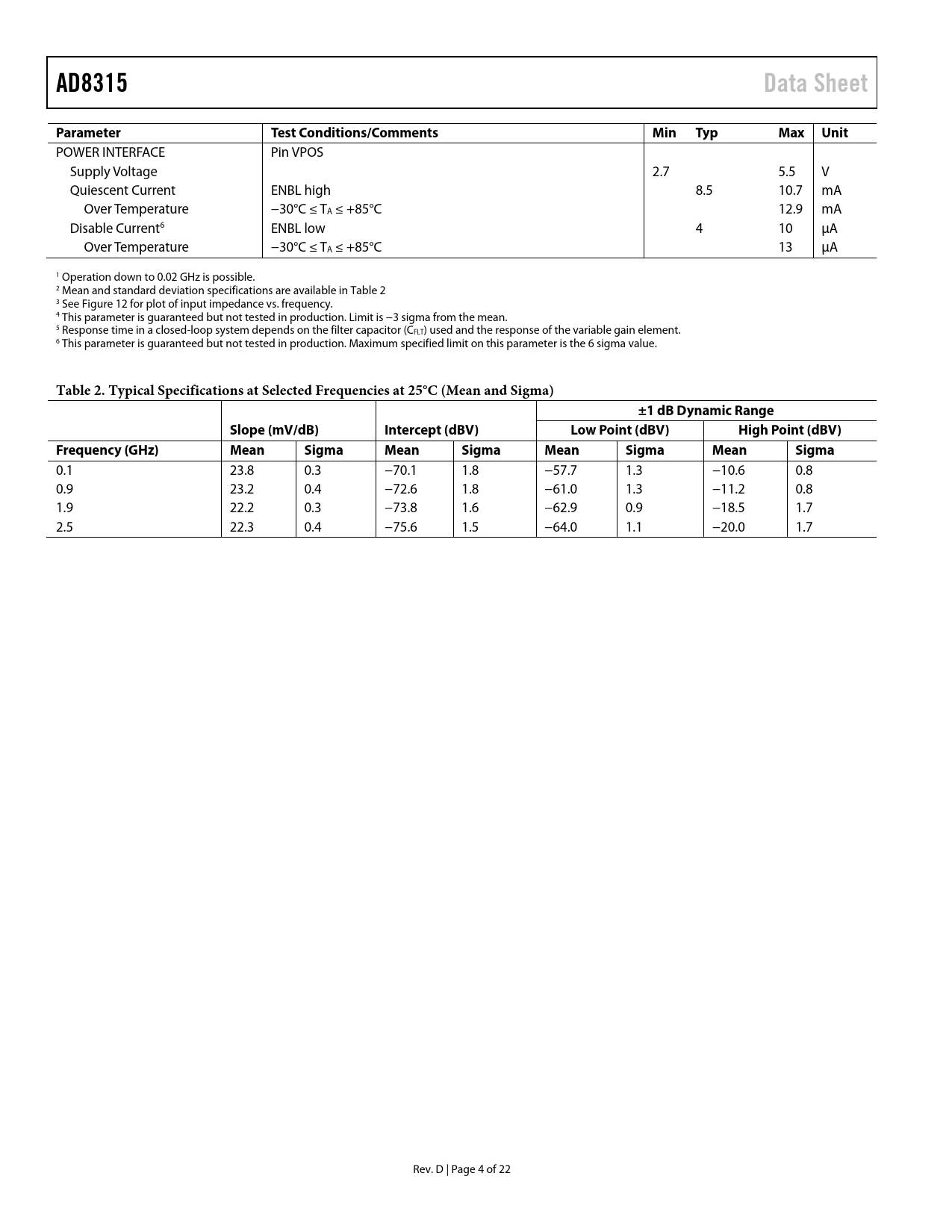 POWER INTERFACE Pin VPOS Supply Voltage 2.7 5.5 V Quiescent Current ENBL high 8.5 10.7 mA Over Temperature −30°C ≤ TA ≤ +85°C 12.9 mA Disable Current6 ENBL low 4 10 μA Over Temperature −30°C ≤ TA ≤ +85°C 13 μA 1 Operation down to 0.02 GHz is possible. 2 Mean and standard deviation specifications are available in Table 2 3 See Figure 12 for plot of input impedance vs. frequency. 4 This parameter is guaranteed but not tested in production. Limit is −3 sigma from the mean. 5 Response time in a closed-loop system depends on the filter capacitor (CFLT) used and the response of the variable gain element. 6 This parameter is guaranteed but not tested in production. Maximum specified limit on this parameter is the 6 sigma value.
