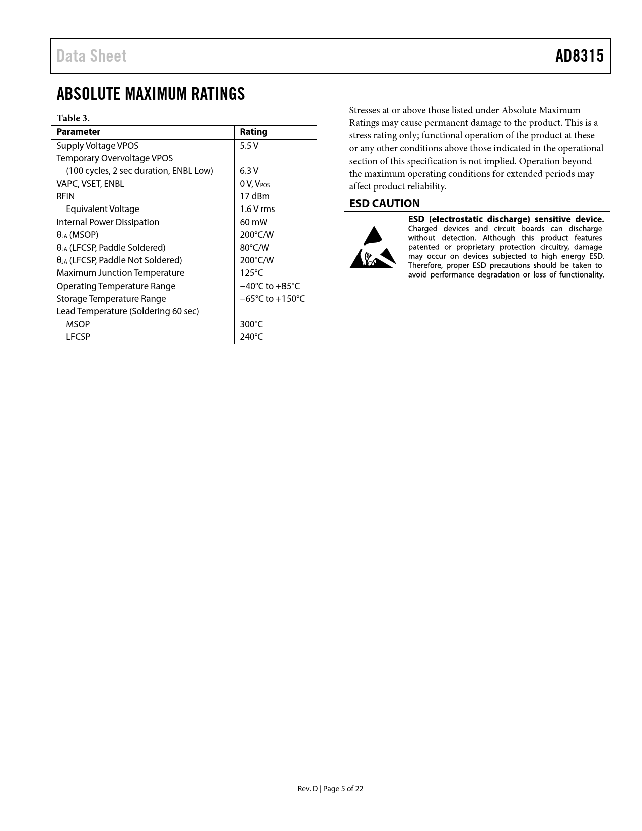 Data Sheet. AD8315. ABSOLUTE MAXIMUM RATINGS. Table 3. Parameter Rating. ESD CAUTION