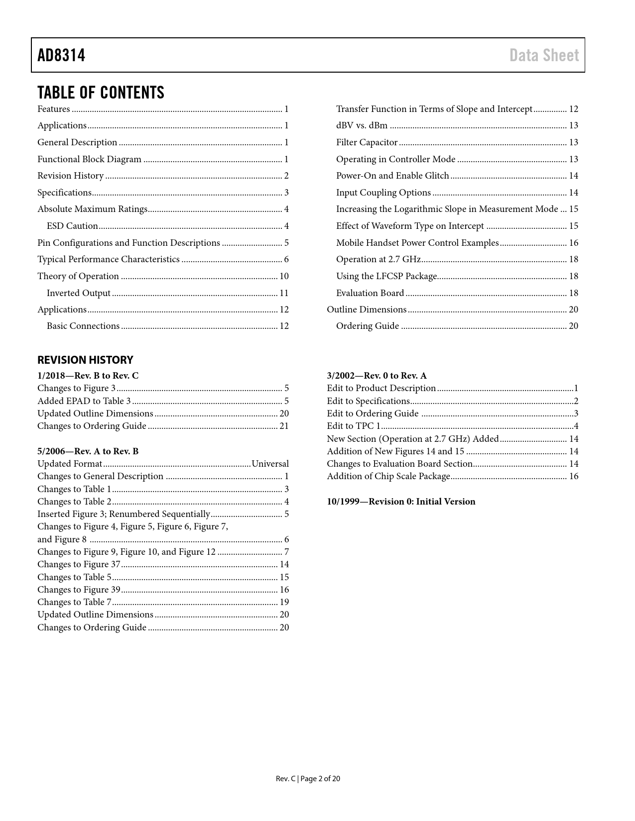 AD8314. Data Sheet. TABLE OF CONTENTS. REVISION HISTORY 1/2018—Rev. B to Rev. C. 3/2002—Rev. 0 to Rev. A. 5/2006—Rev. A to Rev. B