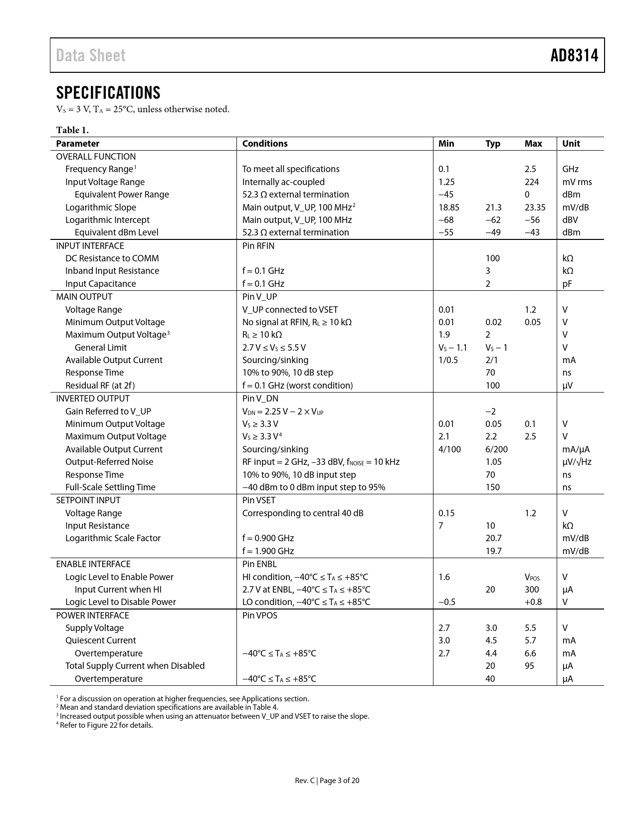 Data Sheet AD8314 SPECIFICATIONS Table 1 Parameter Conditions Min Typ Max Unit