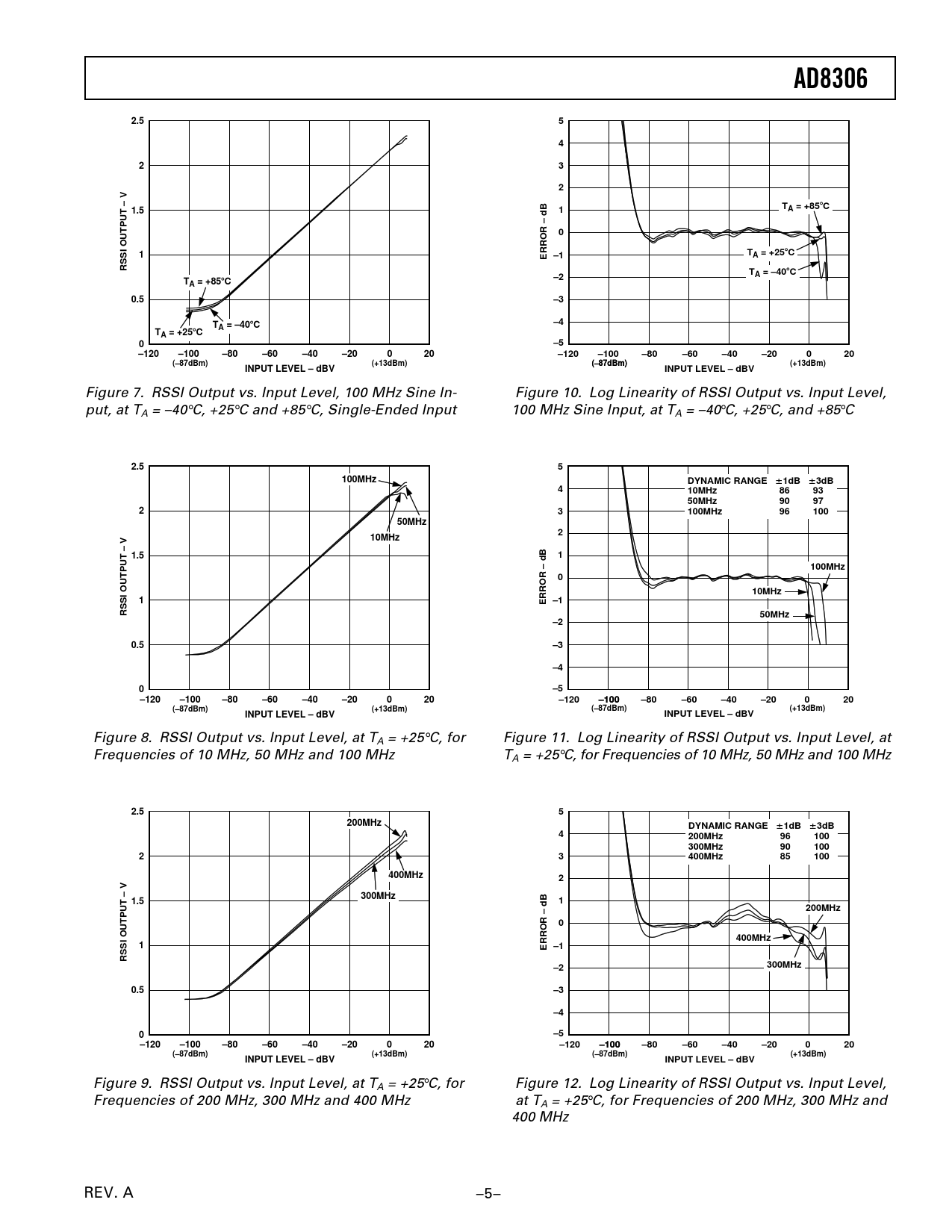 AD8306. 2.5. 1.5. A = +85. ERROR – dB –1. TA = +25. RSSI OUTPUT – V. A = –40. TA = +85. 0.5. A = +25. –120. –100. –80. –60. –40. –20. (–87dBm). (+13dBm)