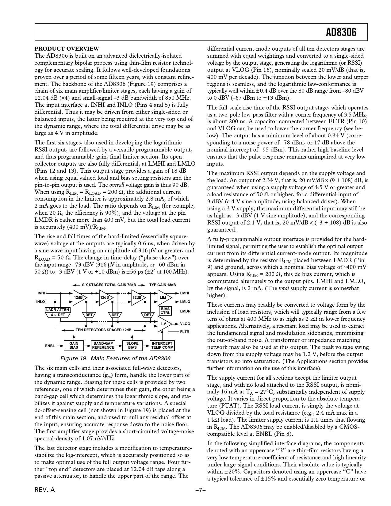 AD8306. PRODUCT OVERVIEW. SIX STAGES TOTAL GAIN 72dB. TYP GAIN 18dB. INHI. LMHI. 12dB. LIM. INLO. LMLO. LADR ATTEN. BIAS. LMDR. CTRL. DET. I–V. VLOG