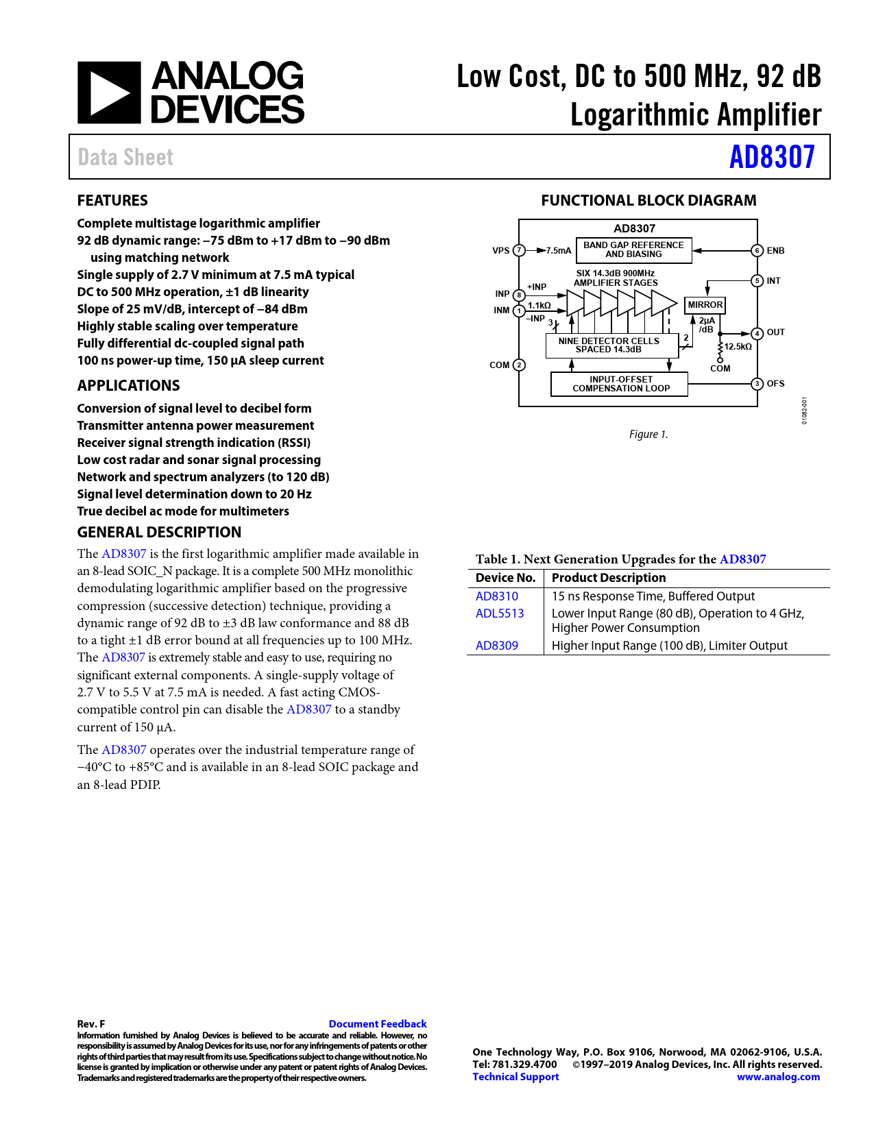 Low Cost, DC to 500 MHz, 92 dB. Logarithmic Amplifier. Data Sheet. AD8307. FEATURES. FUNCTIONAL BLOCK DIAGRAM