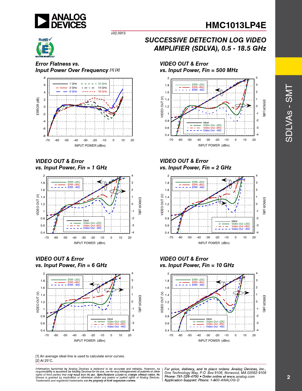 SUCCESSIVE DETECTION LOG VIDEO AMPLIFIER (SDLVA), 0.5 - 18.5 GHz Error Flatness vs. VIDEO OUT & Error Input Power Over Frequency [1] [2] vs. Input Power, Fin = 500 MHz