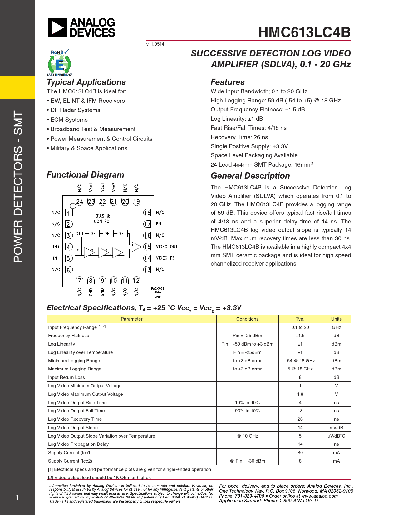 HMC613LC4B v11.0514 SUCCESSIVE DETECTION LOG VIDEOAMPLIFIER (SDLVA), 0.1 - 20 GHzTypical ApplicationsFeatures The HMC613LC4B is ideal for: Wide Input Bandwidth; 0.1 to 20 GHz • EW, ELINT & IFM Receivers High Logging Range: 59 dB (-54 to +5) @ 18 GHz T • DF Radar Systems Output Frequency Flatness: ±1.5 dB M • ECM Systems Log Linearity: ±1 dB S • Broadband Test & Measurement Fast Rise/Fal Times: 4/18 ns - Recovery Time: 26 ns • Power Measurement & Control Circuits Single Positive Supply: +3.3V • Military & Space Applications RS Space Level Packaging Available O 24 Lead 4x4mm SMT Package: 16mm2 T Functional Diagram C General Description E The HMC613LC4B is a Successive Detection Log T Video Amplifier (SDLVA) which operates from 0.1 to E 20 GHz. The HMC613LC4B provides a logging range D of 59 dB. This device offers typical fast rise/fall times R of 4/18 ns and a superior delay time of 14 ns. The E HMC613LC4B log video output slope is typical y 14 W mV/dB. Maximum recovery times are less than 30 ns. O The HMC613LC4B is available in a highly compact 4x4 P mm SMT ceramic package and is ideal for high speed channelized receiver applications. Electrical Specifications, TA = +25 °C Vcc = Vcc = +3.3V12 Parameter Conditions Typ. Units Input Frequency Range [1][2] 0.1 to 20 GHz Frequency Flatness Pin = -25 dBm ±1.5 dB Log Linearity Pin = -50 dBm to +3 dBm ±1 dBm Log Linearity over Temperature Pin = -25dBm ±1 dB Minimum Logging Range to ±3 dB error -54 @ 18 GHz dBm Maximum Logging Range to ±3 dB error 5 @ 18 GHz dBm Input Return Loss 8 dB Log Video Minimum Output Voltage 1 V Log Video Maximum Output Voltage 1.8 V Log Video Output Rise Time 10% to 90% 4 ns Log Video Output Fall Time 90% to 10% 18 ns Log Video Recovery Time 26 ns Log Video Output Slope 14 mV/dB Log Video Output Slope Variation over Temperature @ 10 GHz 5 µV/dB°C Log Video Propagation Delay 14 ns Supply Current (Icc1) 80 mA Supply Current (Icc2) @ Pin = -30 dBm 8 mA [1] Electrical specs and performance plots are given for single-ended operation [2] Video output load should be 1K Ohm or higher. I F nf o or r p mati r o in cfe ur , d nish e e l d iv b e y r A y a nalo n g d t Devi o p ces i la s c bele o ieve rd d t e o rbs e : H acc iutrtatite e M and ic reli rao bl w e. a H v o e C wever o , nrp o For price, delivery, and to place orders: Analog Devices, Inc., responsibility is assumed by Analog Devices for its use, nor for any infringements of patents or other oration, 2 Elizabeth Drive, Chelmsford, MA 01824 One Technology Way, P.O. Box 9106, Norwood, MA 02062-9106 Phone: 978-250-3343 Fax: 978-250-3373 O rights of third parties that may result from its use. Specifications subject to change without notice. No rd Phoe n r O e: 7 n- 81-li 3 n 2 e a 9-4 t w 70 ww 0 • O . rdh e itt r o it nle i . n co e a m 1 license is granted by implication or otherwise under any patent or patent rights of Analog Devices. t www.analog.com Application Support: Phon Trademarks and registered trademarks are the property of their respective owners. e: 978-250-334 A 3 o pplic r a atio pp n S s u @ p h por ittti : Pte ho.c n o e m : 1-800-ANALOG-D