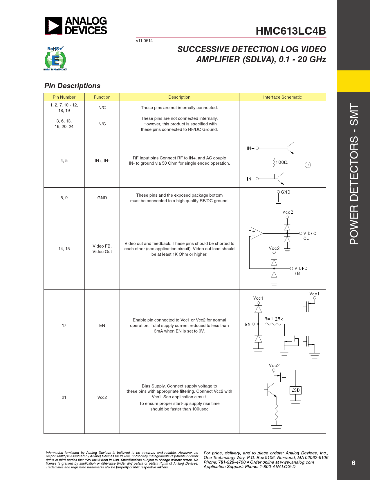 HMC613LC4B. SUCCESSIVE DETECTION LOG VIDEO. AMPLIFIER (SDLVA), 0.1 - 20 GHz. Pin Descriptions