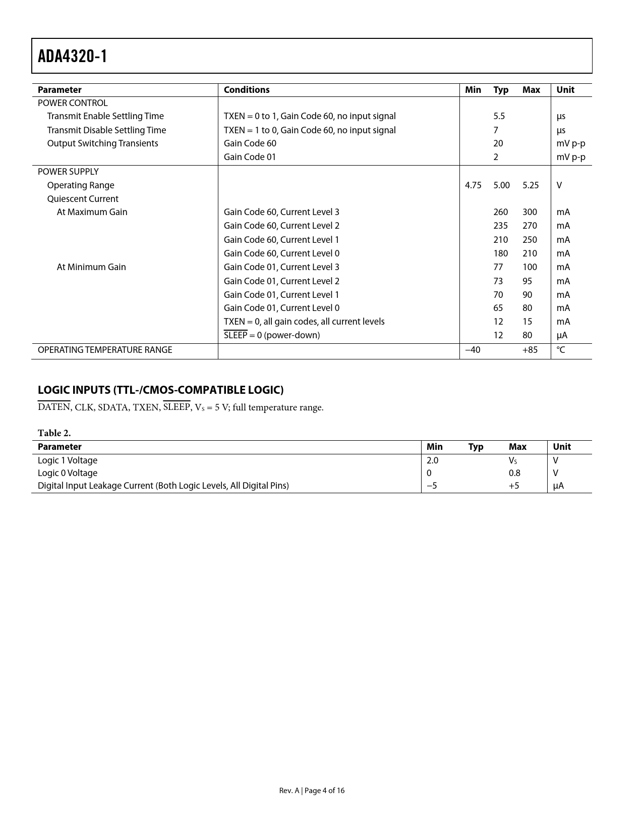 ADA4320-1 ParameterConditionsMin TypMaxUnit POWER CONTROL Transmit Enable Settling Time TXEN = 0 to 1, Gain Code 60, no input signal 5.5 μs Transmit Disable Settling Time TXEN = 1 to 0, Gain Code 60, no input signal 7 μs Output Switching Transients Gain Code 60 20 mV p-p Gain Code 01 2 mV p-p POWER SUPPLY Operating Range 4.75 5.00 5.25 V Quiescent Current At Maximum Gain Gain Code 60, Current Level 3 260 300 mA Gain Code 60, Current Level 2 235 270 mA Gain Code 60, Current Level 1 210 250 mA Gain Code 60, Current Level 0 180 210 mA At Minimum Gain Gain Code 01, Current Level 3 77 100 mA Gain Code 01, Current Level 2 73 95 mA Gain Code 01, Current Level 1 70 90 mA Gain Code 01, Current Level 0 65 80 mA TXEN = 0, all gain codes, all current levels 12 15 mA SLEEP = 0 (power-down) 12 80 μA OPERATING TEMPERATURE RANGE −40 +85 °C LOGIC INPUTS (TTL-/CMOS-COMPATIBLE LOGIC) DATEN, CLK, SDATA, TXEN, SLEEP, VS = 5 V; full temperature range. Table 2. ParameterMinTypMaxUnit Logic 1 Voltage 2.0 VS V Logic 0 Voltage 0 0.8 V Digital Input Leakage Current (Both Logic Levels, All Digital Pins) −5 +5 μA Rev. A | Page 4 of 16 Document Outline FEATURES APPLICATIONS GENERAL DESCRIPTION FUNCTIONAL BLOCK DIAGRAM TABLE OF CONTENTS REVISION HISTORY SPECIFICATIONS LOGIC INPUTS (TTL-/CMOS-COMPATIBLE LOGIC) TIMING REQUIREMENTS ABSOLUTE MAXIMUM RATINGS THERMAL RESISTANCE MAXIMUM POWER DISSIPATION ESD CAUTION PIN CONFIGURATION AND FUNCTION DESCRIPTIONS TYPICAL PERFORMANCE CHARACTERISTICS APPLICATIONS INFORMATION GENERAL APPLICATIONS CIRCUIT DESCRIPTION PROGRAMMING CURRENT LEVEL AND GAIN ADJUSTMENT POWER SAVING FEATURES INPUT BIAS, IMPEDANCE, AND TERMINATION OUTPUT BIAS, IMPEDANCE, AND TERMINATION POWER SUPPLY SIGNAL INTEGRITY LAYOUT CONSIDERATIONS INITIAL POWER-UP RAMP PIN FEATURE OUTPUT TRANSFORMER OUTLINE DIMENSIONS ORDERING GUIDE