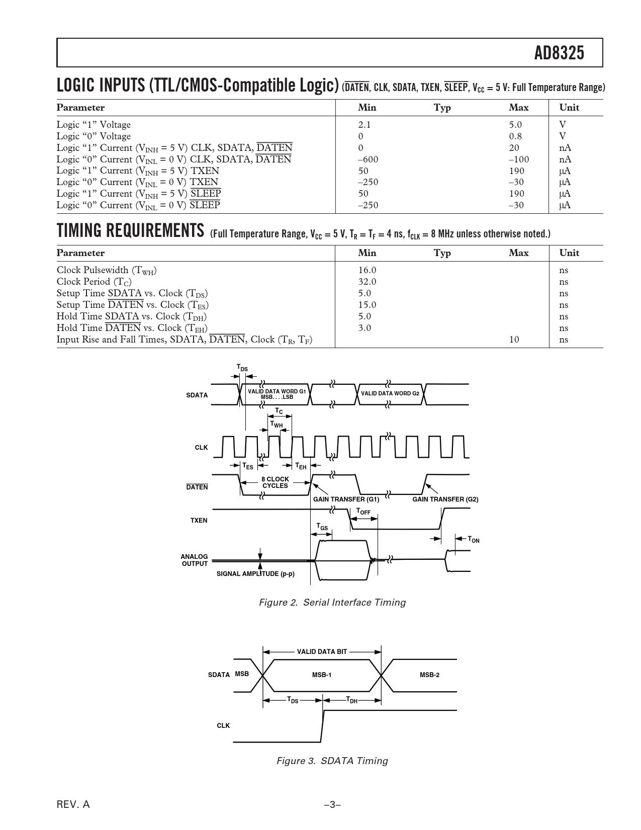AD8325. LOGIC INPUTS (TTL/CMOS-Compatible Logic) (DATEN, CLK, SDATA, TXEN, SLEEP, VCC = 5 V: Full Temperature Range)