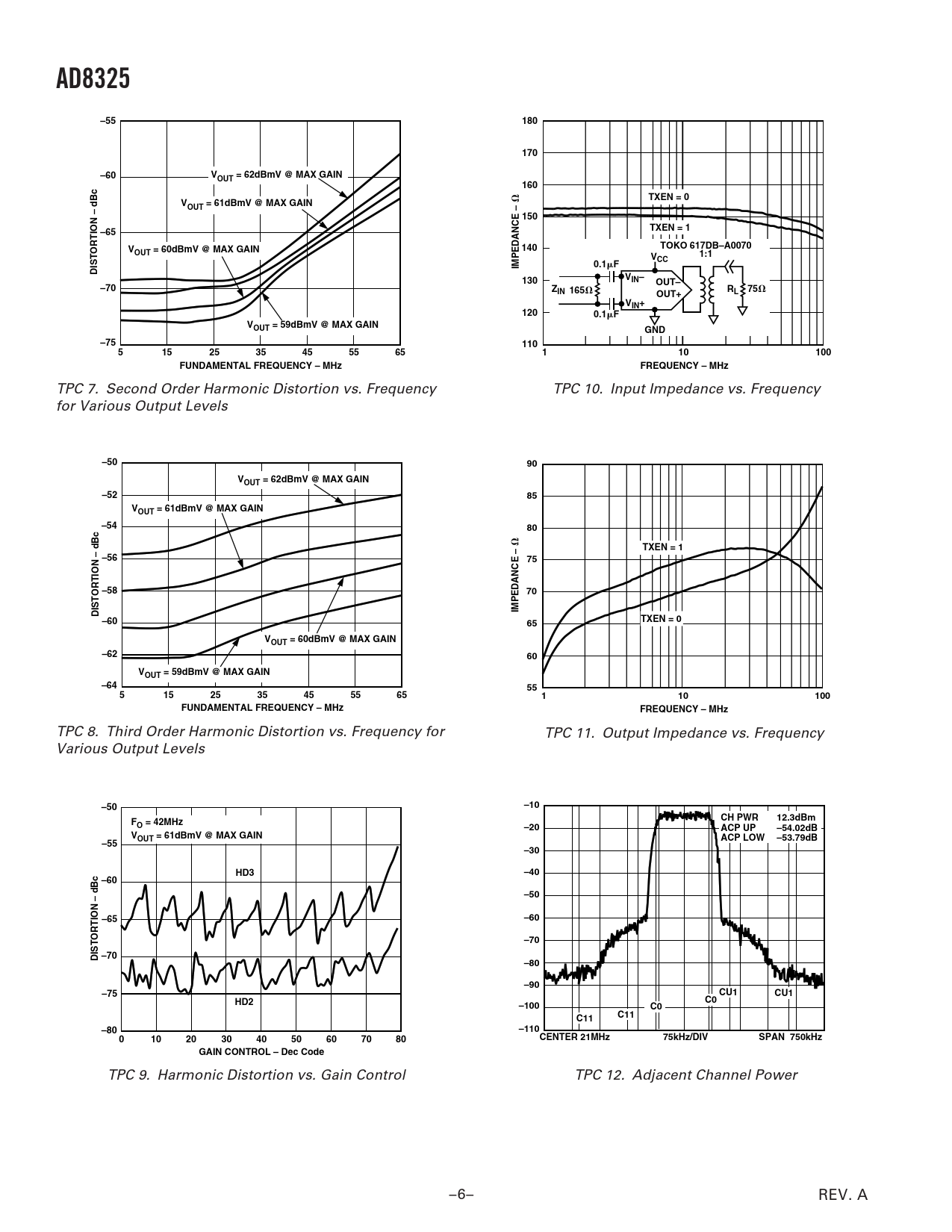 TXEN = 1 –56 75 –58 70 IMPEDANCE – DISTORTION – dBc TXEN = 0 –60 65 VOUT = 60dBmV @ MAX GAIN –62 60 VOUT = 59dBmV @ MAX GAIN –64 55 5 15 25 35 45 55 65 1 10 100 FUNDAMENTAL FREQUENCY – MHz FREQUENCY – MHz