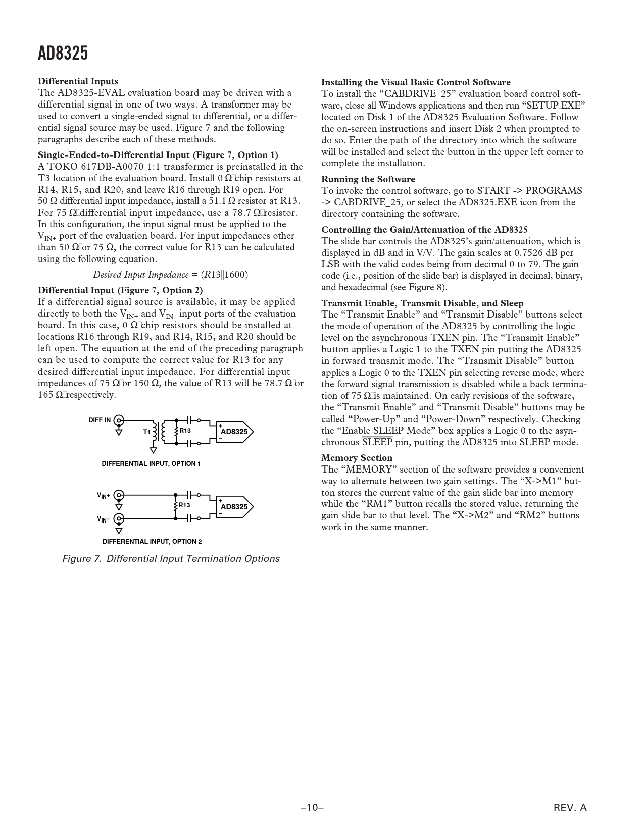 Figure 7. Differential Input Termination Options –10– REV. A Document Outline FEATURES APPLICATIONS GENERAL DESCRIPTION FUNCTIONAL BLOCK DIAGRAM SPECIFICATIONS LOGIC INPUTS TIMING REQUIREMENTS ABSOLUTE MAXIMUM RATINGS PIN CONFIGURATION ORDERING GUIDE PIN FUNCTION DESCRIPTIONS Typical Performance Characteristics APPLICATIONS General Application Operational Description SPI Programming and Gain Adjustment Input Bias, Impedance, and Termination Output Bias, Impedance, and Termination Power Supply Decoupling, Grounding, and Layout Considerations Initial Power-Up Between Burst Operation Distortion, Adjacent Channel Power, and DOCSIS Noise and DOCSIS Evaluation Board Features and Operation Overshoot on PC Printer Ports Transformer and Diplexer Differential Inputs Single-Ended-to-Differential Input Differential Input Installing the Visual Basic Control Software Running the Software Controlling the Gain/Attenuation of the AD8325 Transmit Enable, Transmit Disable, and Sleep Memory Section EVALUATION BOARD FEATURES AND OPERATION EVALUATION BOARD BILL OF MATERIALS OUTLINE DIMENSIONS Revision History