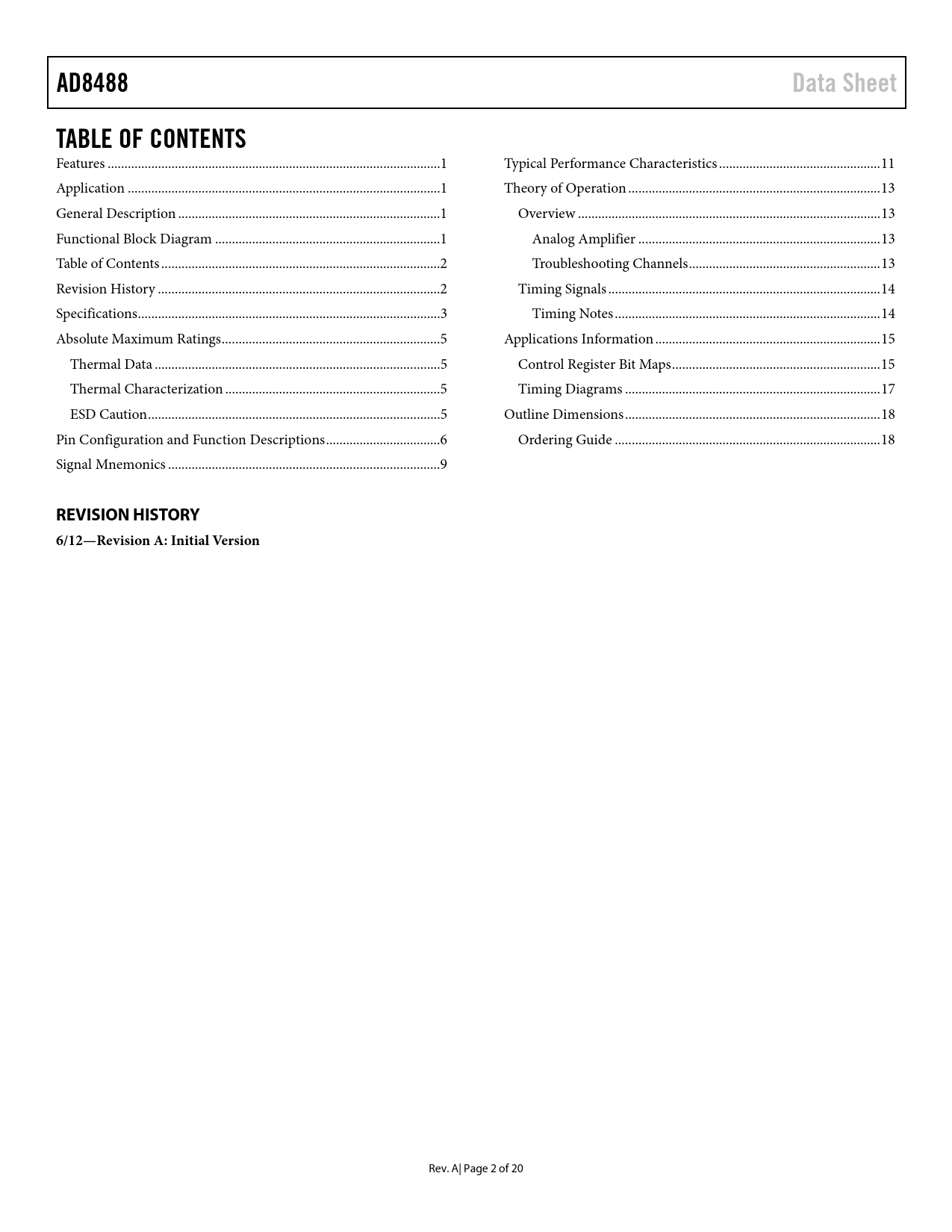 Rev. A| Page 2 of 20 Document Outline Features Application General Description Functional Block Diagram Table of Contents Revision History Specifications Absolute Maximum Ratings Thermal Data Thermal Characterization ESD Caution Pin Configuration and Function Descriptions Signal Mnemonics Typical Performance Characteristics Theory of Operation Overview Analog Amplifier Troubleshooting Channels Timing Signals Timing Notes Applications Information Control Register Bit Maps Timing Diagrams Outline Dimensions Ordering Guide